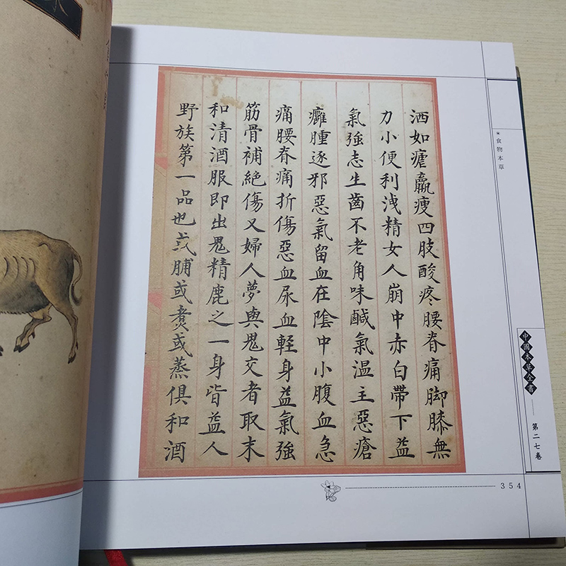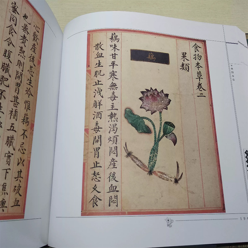 《食物本草》彩繪本,據考證為明朝宮廷寫本 ,乃太醫院奉旨整理撰寫,並由宮廷畫師親自繪製。它因受當時突發事件的影響而未能刊印,此影印本為其首次出版發行,盡現原書原貌,版本極其,且裝幀考察,獨運匠心,中式十二開本,。