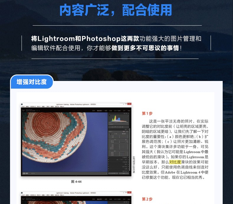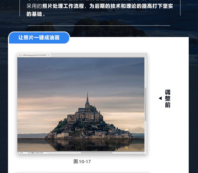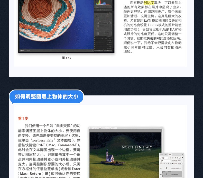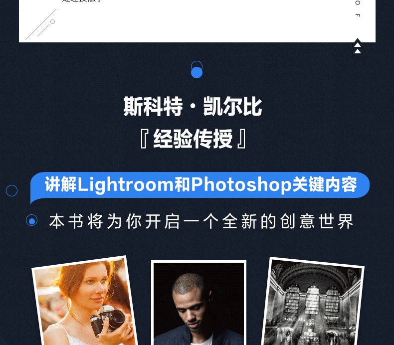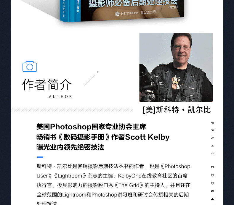 斯科特·凱爾比是 知名攝影師、設計師、攝影教育專家,已出版90餘本圖書並屢次獲獎,他的大部分圖書已經被翻譯成很多種語言,包括漢語、俄語、西班牙語、韓語、波蘭語、法語、德語、意大利語等。他還獲得了ASP 大獎,該獎每年由美國攝影師學會頒發給為專業攝影的藝術性和科學性做出特殊或重大貢獻的人,他也因對世界攝影教學的貢獻榮獲HIPA獎。斯科特是Adobe Photoshop巡迴講座的培訓總監,他在KelbyOne上主講了一系列網上課程,自1993年起就開始培訓攝影師和Adobe Photoshop用戶。