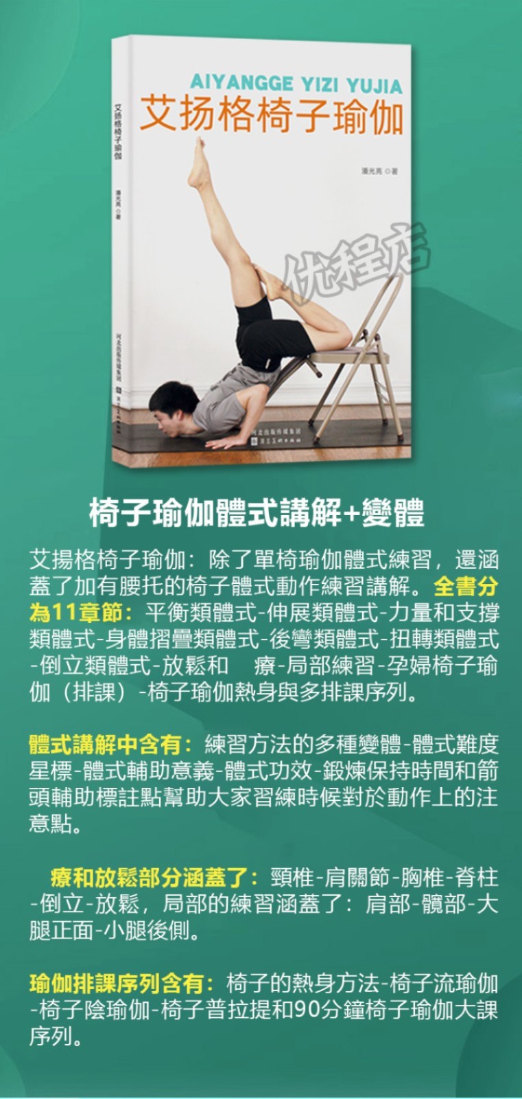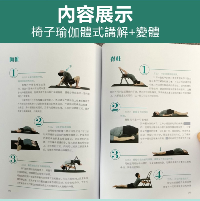 除了單椅瑜珈體位法練習,也涵蓋了加有腰託的椅子體式動作練習講解。 全書分為11章節:平衡類體式-伸展類體式-力量和支撐類體式-身體折疊類體式-後彎類體式-扭轉類體式-倒立類體式-放鬆和療-局部練習-孕婦椅子瑜伽(排 課)-椅子瑜珈熱身與多排課序列。