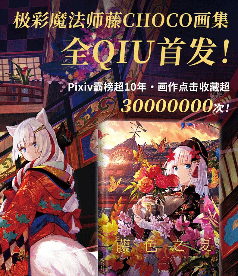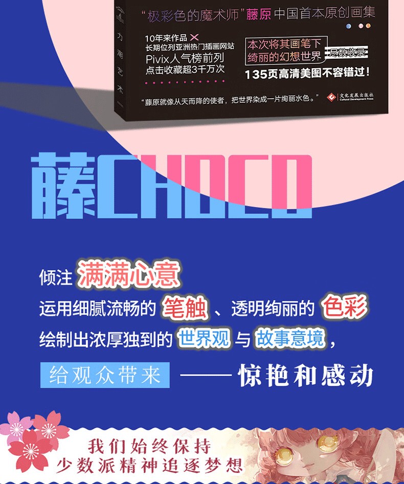 超人氣插畫家藤原以細膩流暢的筆觸、透明絢麗的色彩繪製出濃厚獨到的世界觀與故事意境,10年來作品長期位列PIXIV站人氣榜前列,點擊收藏超3千萬次!今年,藤原全新個人畫集《藤CHOCO藝術畫集》在中國閃亮登場!本次畫集除收錄藤原近年來的原創插畫和版權插畫之外,更有收錄早期經典插畫和參與中國項目所繪製的插畫作品,並且採用16開全彩精美印刷,裸背鎖線裝幀,能完整的展開每幅作品,觀感升級。此外,藤原專為畫集繪製了全新裝畫,邀請大家一起來走進她的幻想色彩世界!