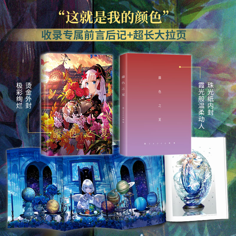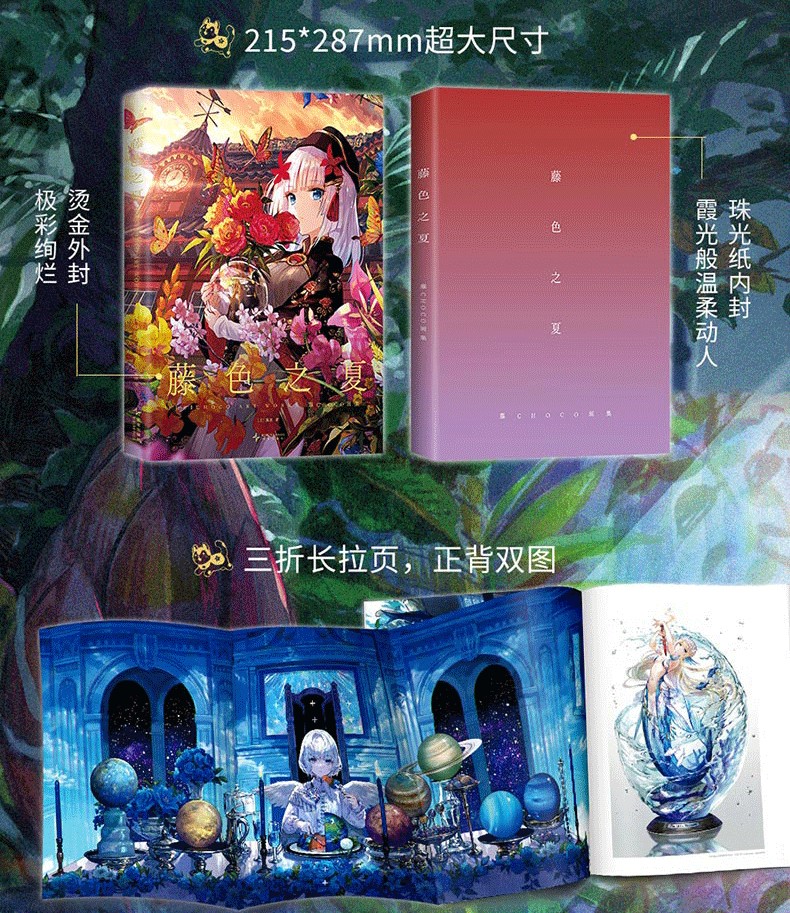 《藤色之夏:藤CHOCO畫集》作為藤原代表性的全/新畫集,收錄150餘幅經典插畫,含30餘幅新繪製作品,帶領我們走進一個充滿幻想與色彩的世界。每一幅畫作都在光影間流淌,場景奇幻動人,人物形象栩栩如生,展現出強烈的個人風格與藝術價值。