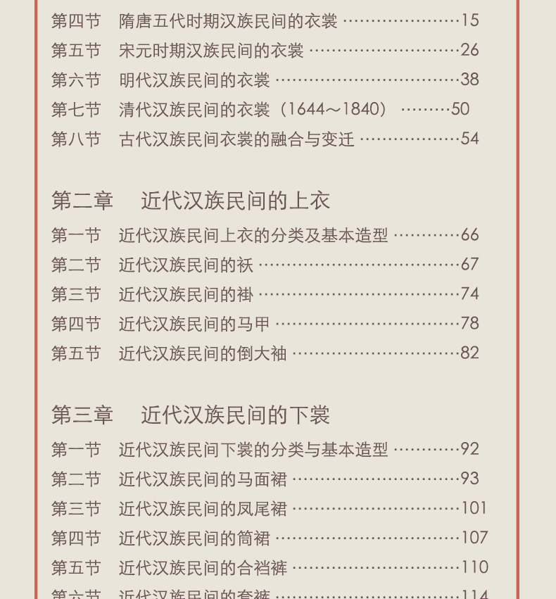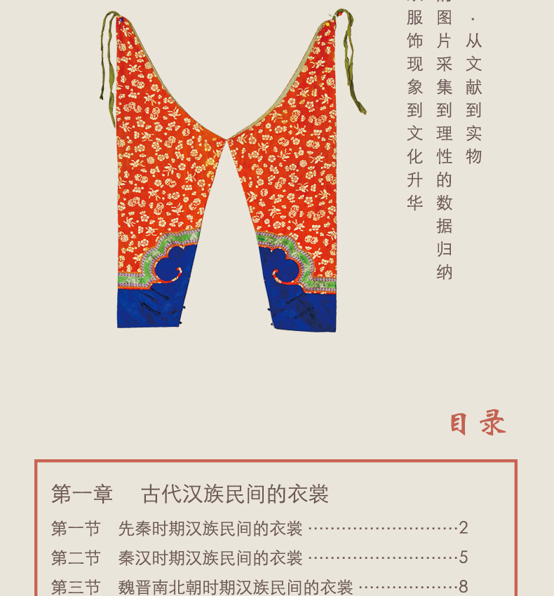 面對“寫在身上的歷史”——漢族民間服裝,作者堅持以虔誠的態度與求實求證的工作宗旨,廣泛研習傳統紡織印染技法、服裝製作技藝、裝飾工藝、民俗內涵等,注重對於造型、紋樣、配飾等設計藝術理論與實踐的探索,並將其與服裝所蘊涵的歷史、社會、心理、美學等文化內涵交叉融合,選取代表性物質文化遺產與非物質文化遺產中的上衣下裳、足服、荷包以及織造、印染、製作、裝飾等技藝,構建而成“漢族民間服飾譜系”叢書,以期能夠展現豐富多彩的漢民族服飾藝術與深厚的民族服飾思想。
