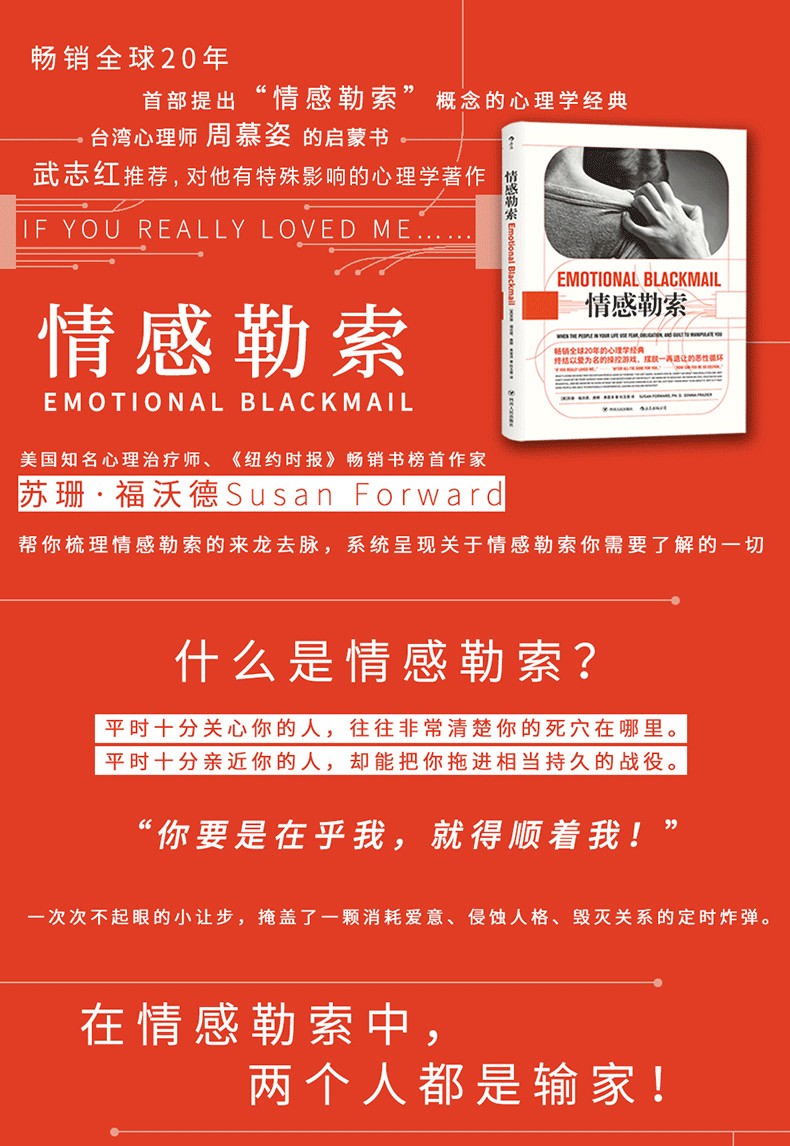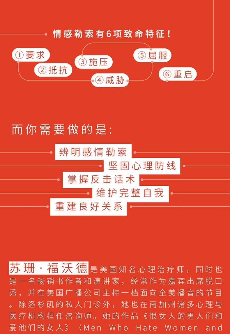 這導致了很多人際關係噩夢的基本形式——情感勒索。勒索者抓住受害者的恐懼感、責任感和罪惡感,雙方一起被困在惡性循環之中。福沃德對情感勒索的根源做了、深刻的分析,並對勒索者和受害者的類型做了歸納。一段關係之所以能墜入勒索的陷阱,是勒索者和受害者雙方的弱點共同造成的。而情感勒索看似以受害者讓步、勒索者滿足告終,實際上侵害了受害者的自我完整性,也讓勒索者的心態更加扭曲,關係中的問題依然沒有得到解決。她告訴我們,面對情感勒索時,如何應對才是正確的,我們可以通過一些簡單的訓練學會擺脫情感勒索的方法。 *重要的是:擺正立場,堅定信心。