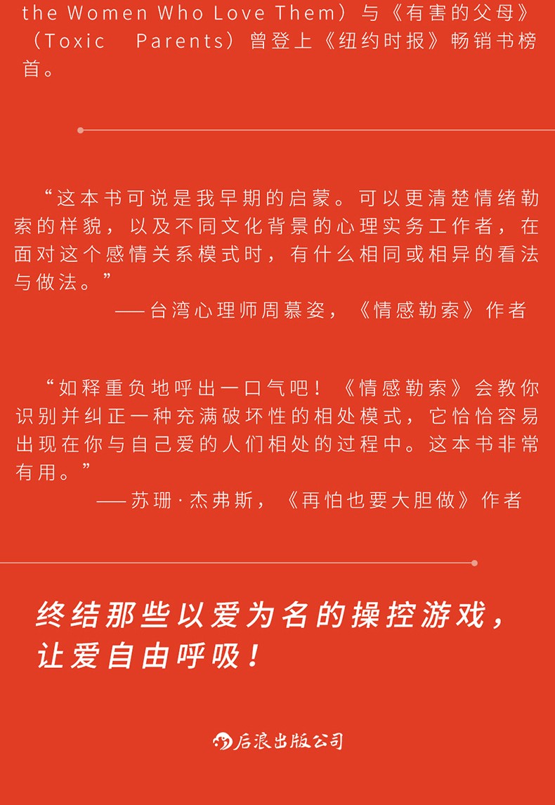 如釋重負地呼出一口氣吧! 《情感勒索》會教你識別並糾正一種充滿破壞性的相處模式,它恰恰容易出現在你與自己愛的人們相處的過程中。這本書非常有用。