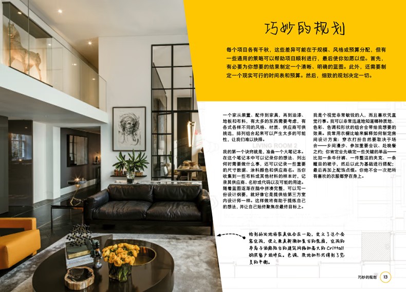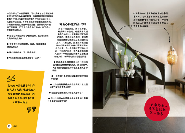 第一部分導入部分在書的第一部分,凱莉赫本介紹了一些實用技巧。除此之外,她還向讀者們拋出了一個重要的問題:“家對你來說意味著什麼?”在風格方面,凱麗赫本崇尚“平衡”與“和諧”,她喜歡在平靜的空間加入張力。在設計上,她也勇於嘗試不同的搭配,對稱和對比都是她經常使用的一些設計技巧。同時,赫本也注重各部分的比例和形式,還有各種家具的擺放,有時她也會靈活運用設計網格。