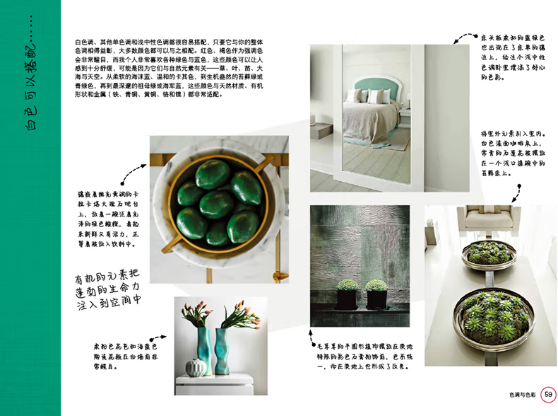 第二部分. 掌握設計風格的首要原則 凱麗赫本在這部分提到了幾個關於提升室內設計的關鍵因素。當談到室內配色方案時,人們通常會將凱莉赫本的作品與中性色調劃上等號。赫本確實對淡雅別緻的中性色青睞有加,因為它們是佳且百搭的背景色,其他任何強調色都可以與之搭配但是赫本也從來不會固步自封,她也經常使用很多鮮豔明亮的強調色,為整體空間增添光彩。她在書中教大家如何選擇配色方案,也舉了許多配色和搭配方案作為範例。