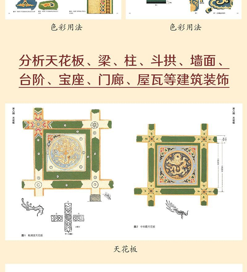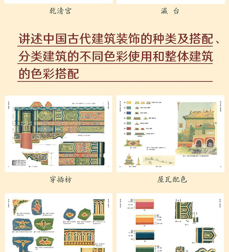 數量豐富的手繪忠實還原中國建築的結構、圖樣、顏色搭配等情況,再配以圖注進行進一步說明。