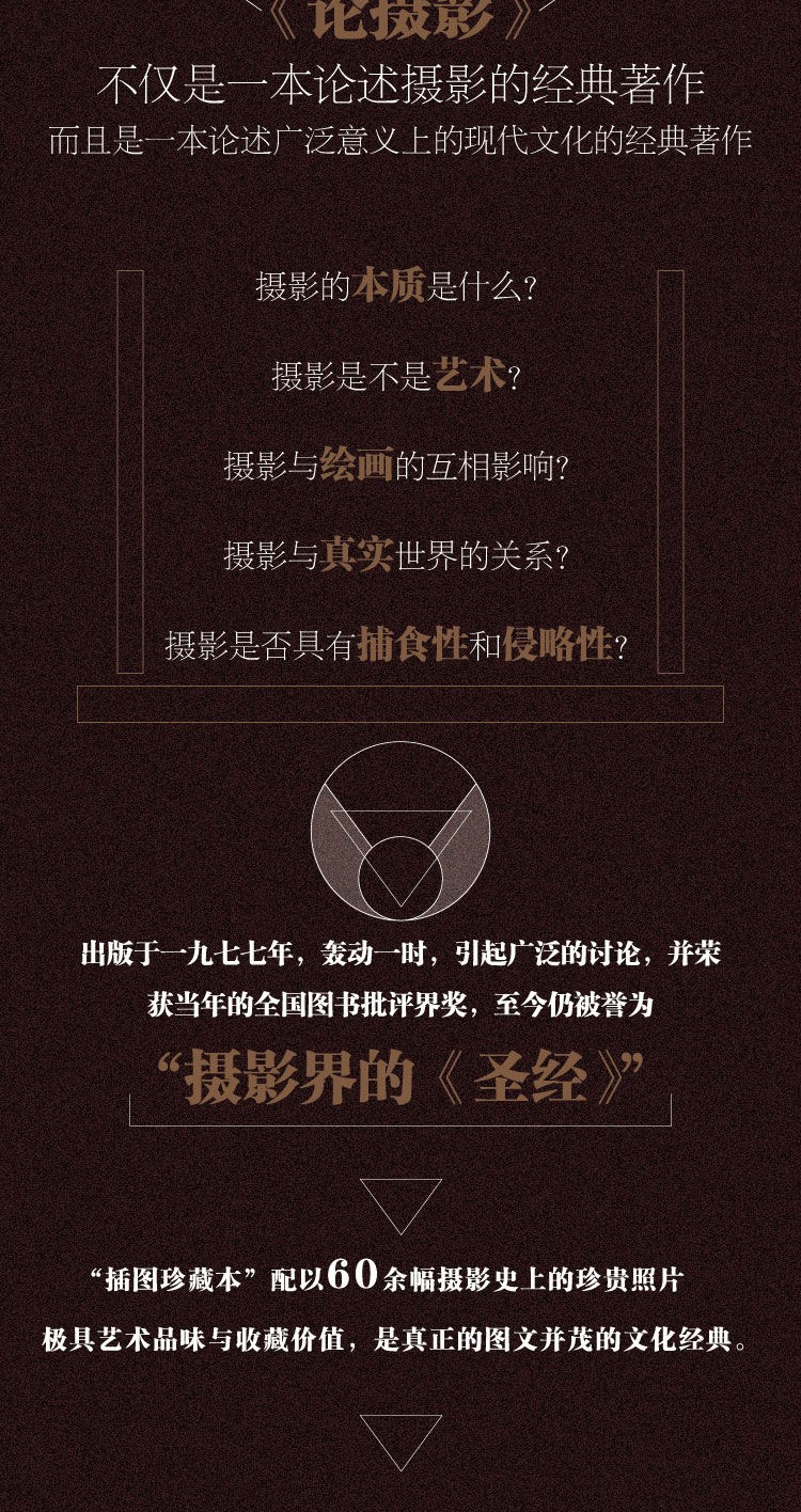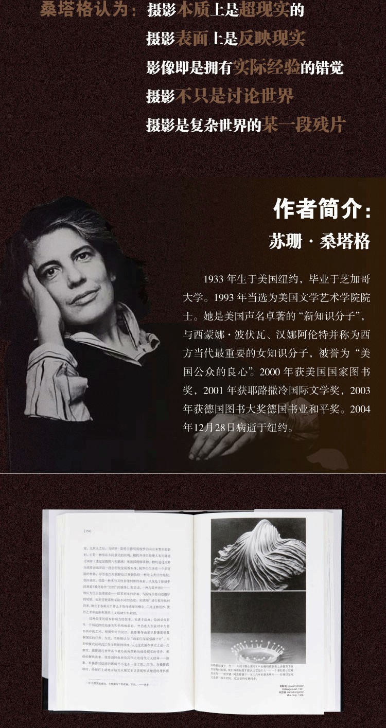 蘇珊·桑塔格著的《論攝影(插圖珍藏本)(精)》不僅是一本論述攝影者的經典著作,而且是一本論述廣泛意義上的現代文化的經典著作。它不是一本專業著作,書中也沒有多少攝影術語,儘管有志於攝影者,應人手一冊。它的對象主要是知識分子、作家和文化人。
