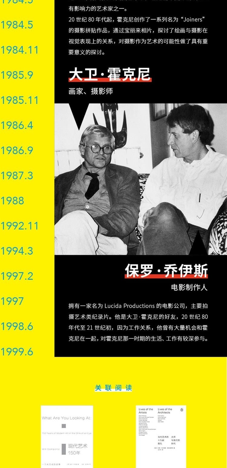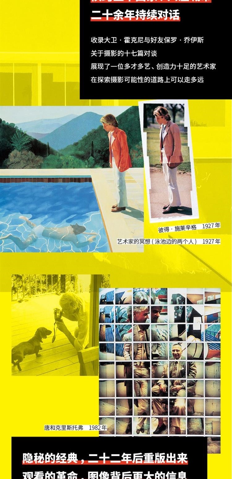 《霍克尼論攝影》(增訂本)收錄了大衛·霍克尼與好友保羅·喬伊斯關於攝影的對談十七篇,內容關於霍克尼的圖像思考與影像實驗,展現了一位多才多藝、創造力十足的藝術家,在探索攝影可能性的道路上可以走多遠。觀看與空間,是霍克尼一如既往的關注。在本書中,他認為拼貼是擺脫傳統觀看方式的關鍵,是對錶面的確認。霍克尼將自己的創作看作是用攝影來批判攝影。 “畢竟,光用言語是不行的。你得使用攝影的語言。” 《霍克尼論攝影》充分體現了一位傑出藝術家的實踐自覺與理論自覺。作為大衛·霍克尼專享一部專⻔論述攝影與影像藝術的著作,本書第一版曾在1994年被引進中國,在藝術相關專業的師生群體中引起了廣泛討論。此後的二十餘年,隨著大衛·霍克尼著作的中文版陸續推出,本書逐漸淡出了國內讀者的視野。理想國首次引進增訂本,期待它將持續激起新的、更大的水花。