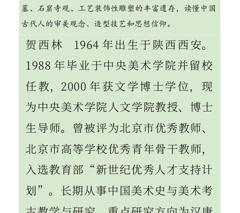 賀西林,1964年出生於陝西西安。 1988年畢業於中央美術學院並留校任教,2000年獲文學博士學位,現為中央美術學院人文學院教授、博士生導師。曾被評為北京市優秀教師、北京市高等學校優秀青年骨干教師,入選教育部“新世紀優秀人才支持計劃”。長期從事中國美術史與美術考古教學與研究,重點研究方向為漢唐視覺文化。