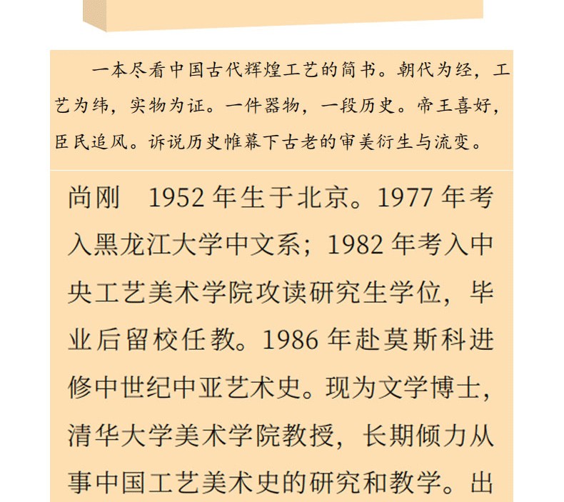 尚剛,1952年生於北京。 1977年考入黑龍江大學中文系;1982年考入中央工藝美術學院攻讀研究生學位,畢業後留校任教。 1986年赴莫斯科進修中世紀中亞藝術史。現為文學博士,清華大學美術學院教授,長期傾力從事中國工藝美術史的研究和教學。出版的著作有《隋唐五代工藝美術史》《元代工藝美術史》《中國工藝美術史新編》《中國工藝美術史圖說》等。