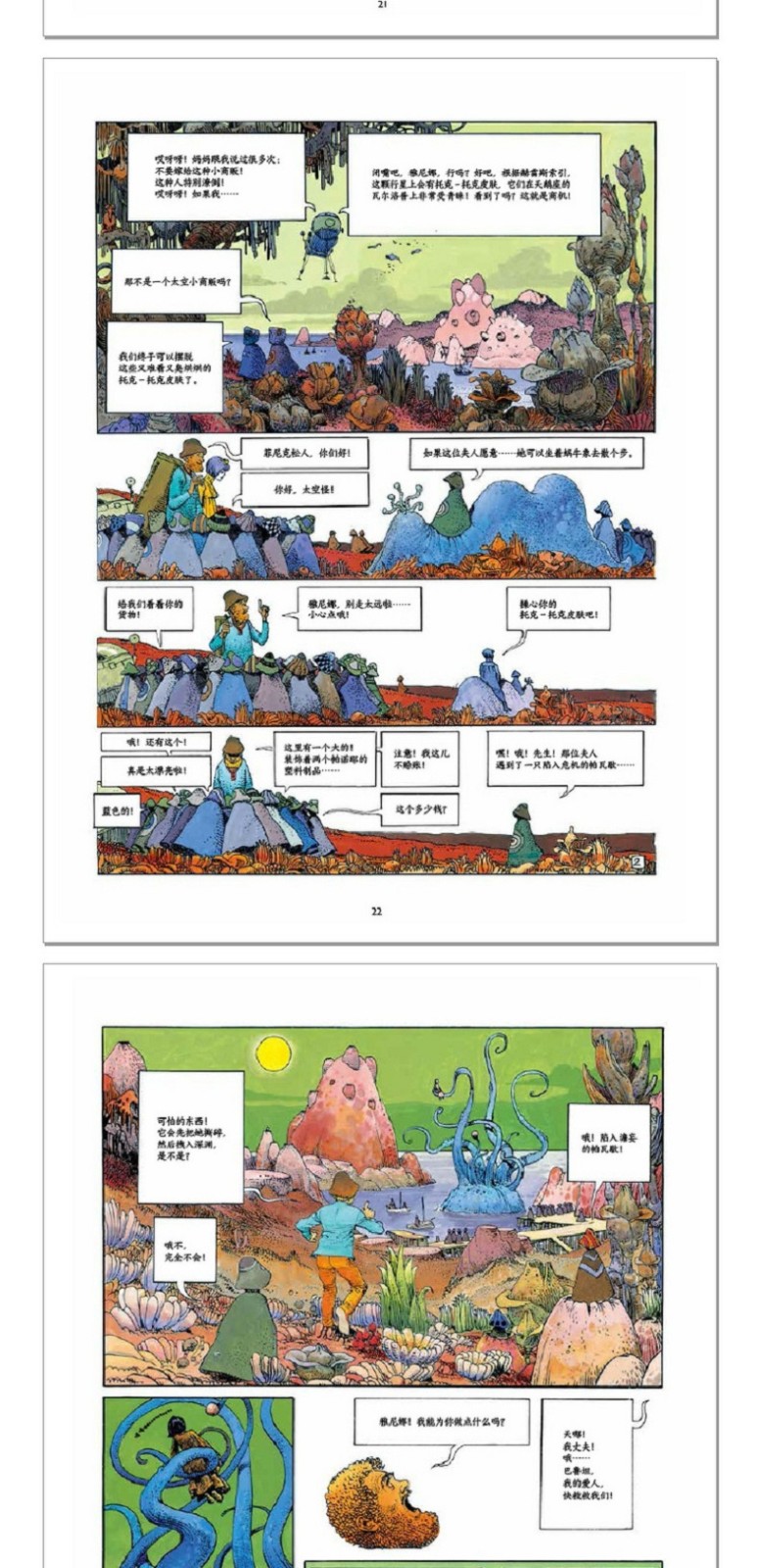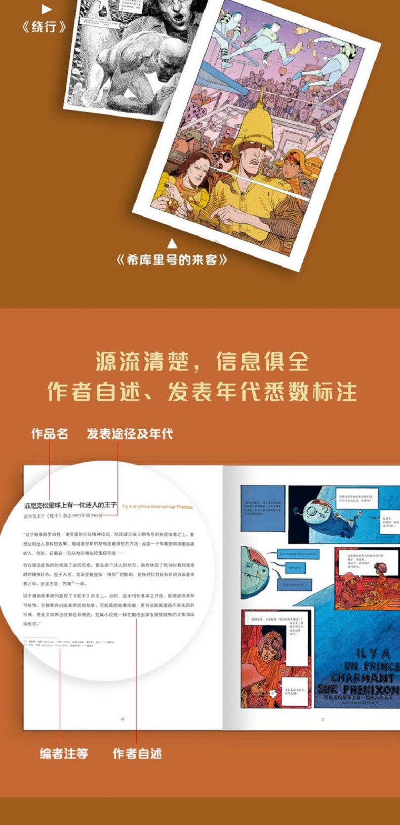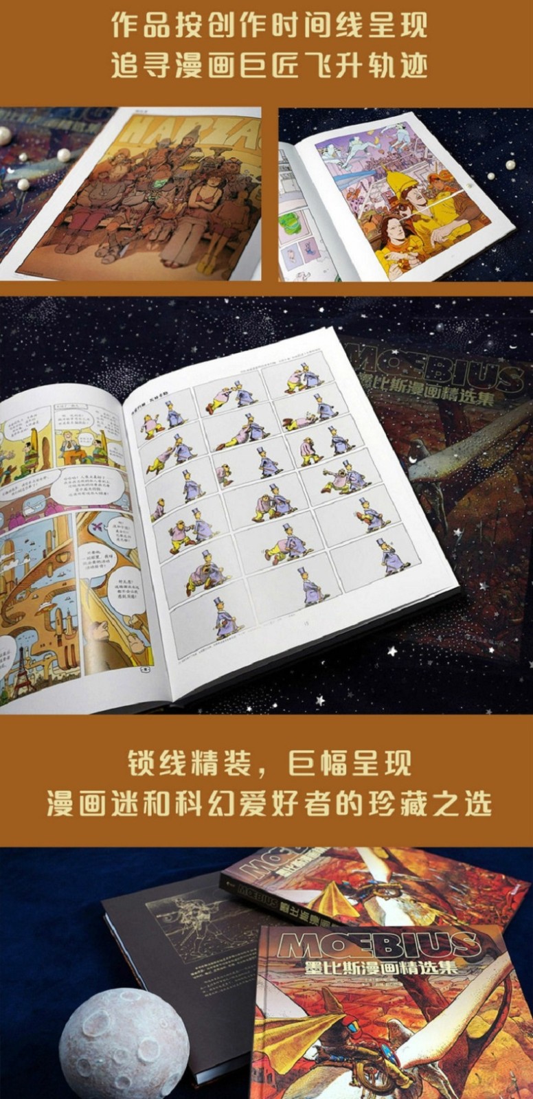 中文版《墨比斯漫畫精選集》從中挑選出30部經典作品,依照創作時間和主題劃分為4個章節,並在每篇故事前標註作品首*發表時間,配以墨比斯自序,便於讀者了解其創作背景。其中te別收錄了讓·吉羅向墨比斯轉型的代表作《繞行》、令墨比斯一炮而紅的《阿扎克》(節選)、《封閉式車庫》的續篇《希庫裡號的來客》,以及墨比斯以漫畫形式創作的關於自己的專訪,可謂一本不容錯過的墨比斯集大作。