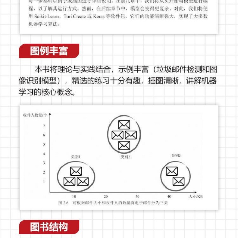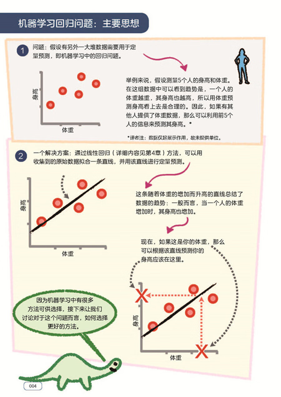 本書前3章著重介紹了機器學習的整體框架和主要思想,從第4章起,介紹了各種機器學習演算法:從基礎的線性回歸(第4章)和邏輯回歸(第6章)到樸素貝葉斯(第7章)和決策樹(第10章),最後介紹了支持向量機(第11章)和神經網路(第12章)。在介紹機器學習演算法的同時,本書也穿插介紹了機器學習的進階知識和實用技巧,如梯度下降法(第5章)、模型效能度量(第8章)和防止過度擬合的正規化方法(第9章)。
