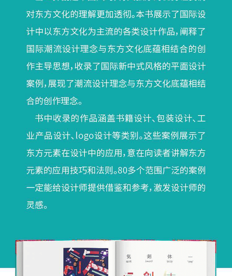 書中涵蓋了諸多內容,涵蓋品牌、包裝、招貼、店面、書籍等,展示了以東方文化為主流的各類設計作品,豐富的案例讓讀者更能了解設計者如何靈活多變地把東方文化運用到設計中,闡釋了國際潮流設計理念與東方文化底蘊相結合的創作主導思想。書中各種獨特的設計必定會啟發讀者無限靈感。