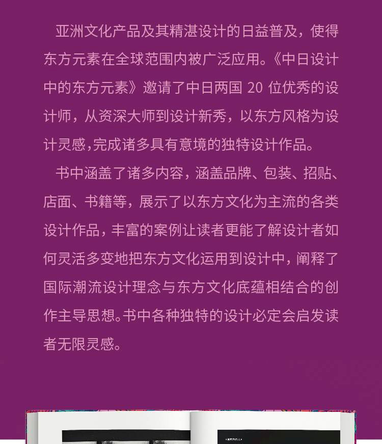 亞洲文化產品及其精湛設計的日益普及,使得東方元素在全球範圍內被廣泛應用。 《中日設計中的東方元素》邀請了中日兩國20位優秀的設計師,從資深大師到設計新秀,以東方風格為設計靈感,完成諸多具有意境的獨特設計作品。