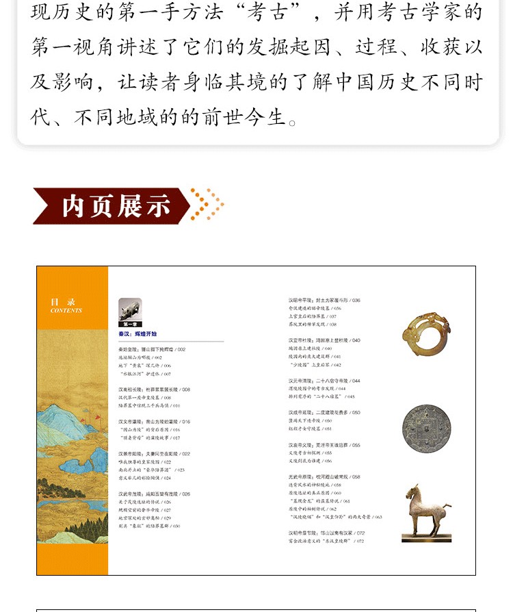 考古現場為考古和歷史愛好者,利用發現歷史的*手方法“考古”通過四個章節分別介紹了我國歷史中國出現的的人類種族、古墓王陵、文字簡牘、古都遺址。本書旨在幫助讀者了解我國考古所取得成就的基本全貌,為此特選取了一些意義重大、深具代表性的考古發現,並詳細地講述了它們的發掘起因、發掘過程、發掘收穫以及發掘的意義與影響。通過大量精美的真圖,展現出歷史的發現者們的*視角,給讀者身臨其境的感覺,更有效,有趣地了解歷史的來龍去脈,並建立起我國不同時代,不同地域的前世今生。