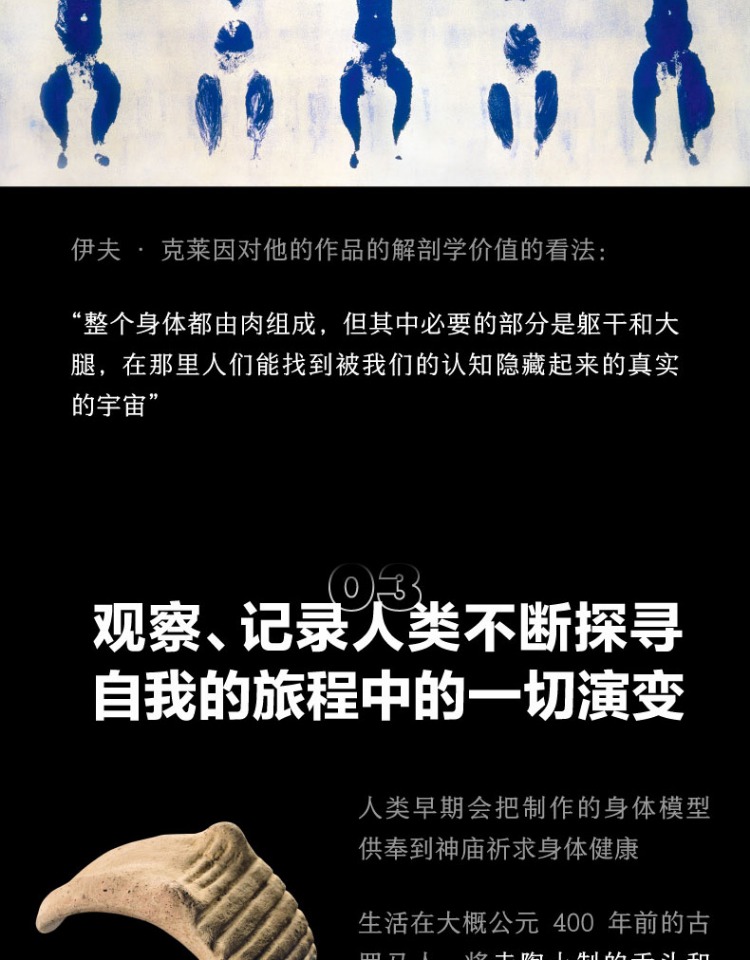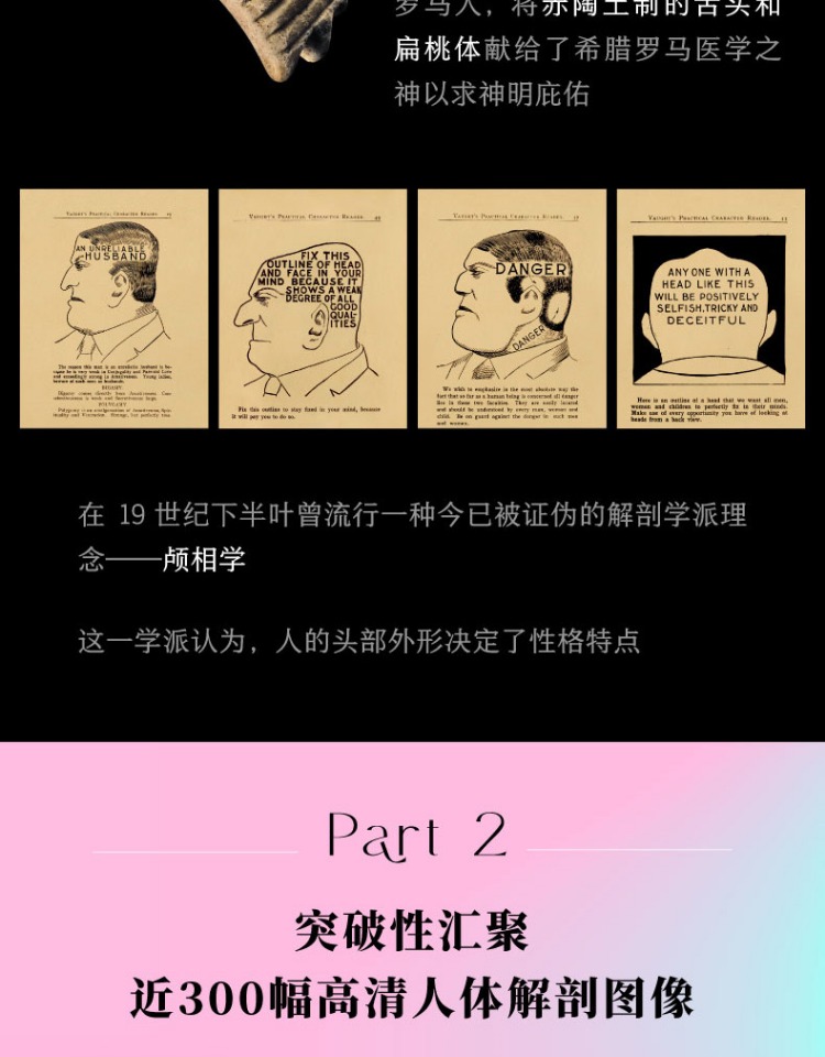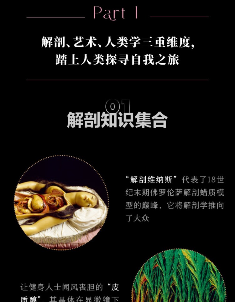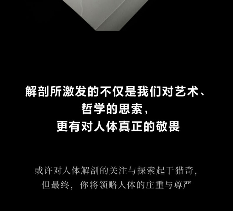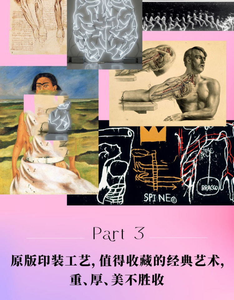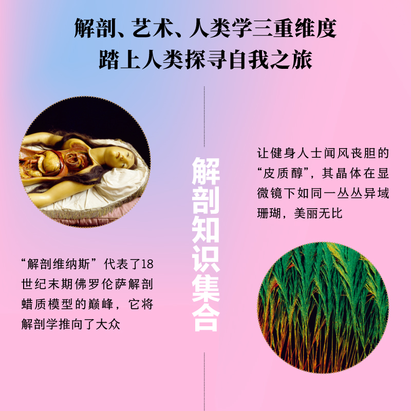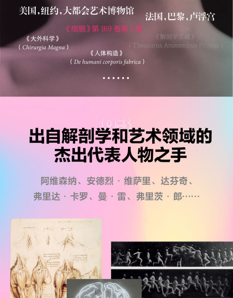 1.突破性匯集來自公元前30000年至今的、橫貫東西的250餘幅人體解剖圖像。我們得以破除人體與生俱來的隱密性,閱讀隱藏於皮膚之下的醫學與藝術探索。這些高清醫學插圖、微觀視圖、古代文物和當代藝術影像,來自世界各大博物館、醫學院、高校圖書館、解剖學著作與私人收藏;它們的作者包括解剖學領域和藝術領域的傑出的人物,如阿維森納、安德烈·維薩裡、瑪麗·雪萊、弗里達·卡羅、曼·雷、弗里茨·郎等。 2.從解剖手稿中,我們能讀取有關人類探索自我的一切。弗蘭肯斯坦的肖像與在塑料芯片上創造人類器官的科學實驗並...