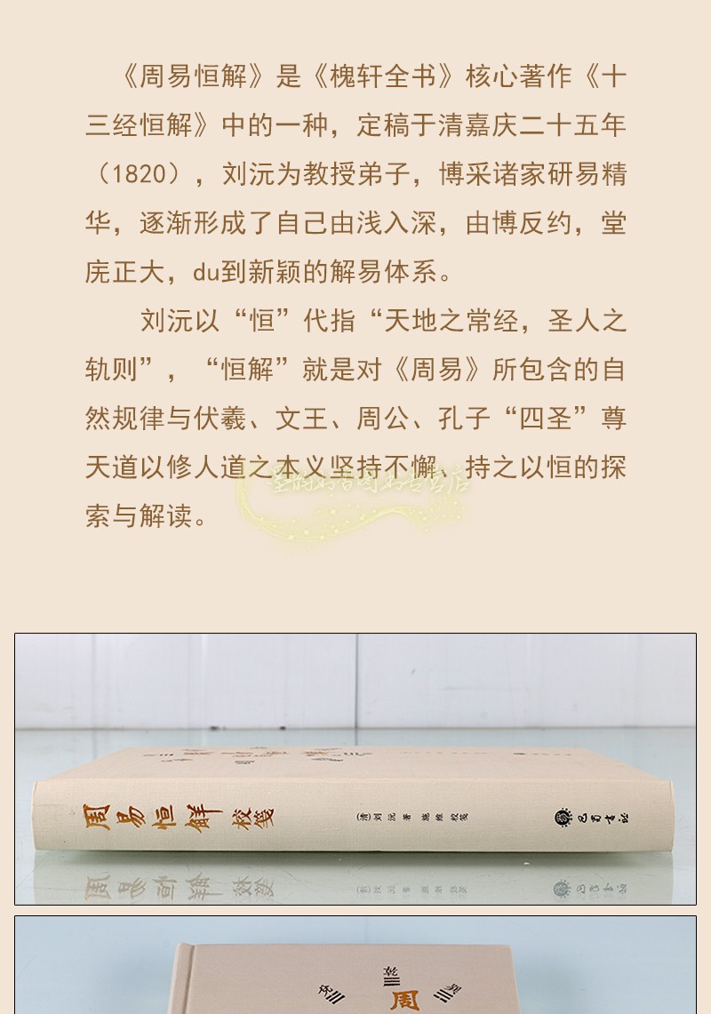 劉沅以畢生之力創立槐軒學說,建構了對儒家經典的「恆解」體系,從文本和義理兩個方面糾正了宋儒對儒家元典的篡改和誤解。 《周易恆解》是《槐軒全書》核心著作《十三經恆解》中的一種,定稿於清嘉慶二十五年(1820),劉沅為教授弟子,博採諸家研易精華,逐漸形成了自己由淺入深,由博反約,廡正大,獨到新穎的解體體系。劉沅以“恆”代指“天地之常經,聖人之軌則”,“恆解”就是對《易》所包含的自然規律與伏羲、文王、周公、孔子“四聖”尊天道以修人道之本義堅持不懈、持之以恆以恆的探索與解讀。劉沅在撰寫本書時,不持門戶之見,博採歷代易家之長,而不附會其偏失,又融通象數與義理二者的關係,並取其所得,棄其所失,每多精論卓見,常能發前人所未發。 《易恆解》分為「串解」「附解」兩部分。串解對經傳的字、詞、句之義、象、數等分爻、分段進行解說考訂,附解就各卦各《傳》大意及前人易說正誤加以辨別。劉沅對《易》的「恆解...