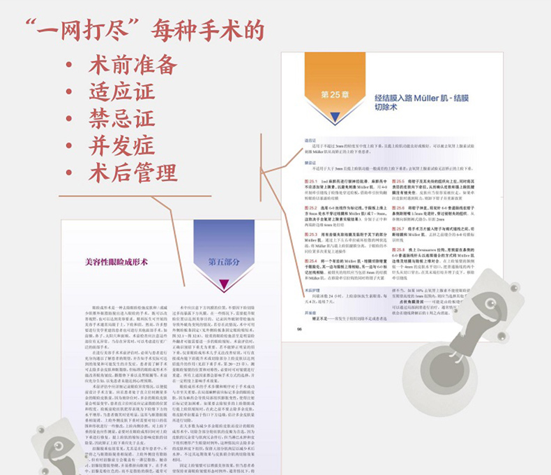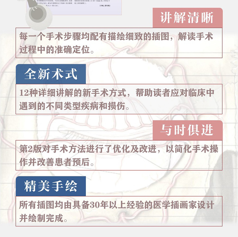 本書分三大篇,23部分,110章,含1100多幅高質量醫學彩繪插圖,講解了100種ZUI常見的眼瞼、淚器和眼眶手術步驟。每一個手術步驟均以清晰的圖片進行演示。對於每一種手術方式,書中還詳細列舉出解剖、術前準備和術後並發症等方面的知識,幫助讀者有效準備手術,大程度避免術後並發症的發生。
