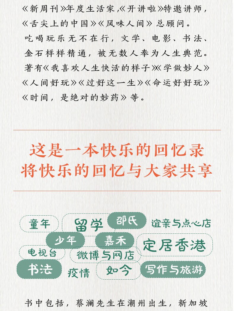 本書是一本蔡瀾的自傳,記錄了蔡瀾先生的生活經驗和他豁達的處世哲學。蔡瀾說:人老了,就愛懷舊,還是多寫一點舊事吧。他將這本書稱作是「一本快樂回憶集」。書中,蔡瀾回憶自己的一生,包括在潮州和新加坡生活的孩童時代;包括在日本的留學時代;包括因緣際會,得六先生賞識,到邵氏工作的經歷;還包括定居香港之後的生活。在書中,可以看到蔡瀾因電影工作,到不同國家居住,期間他結識到無數朋友,與朋友之間的趣事雜談。書中的文章,包羅萬象,有談人生、談寫作、談金錢、談生意、談女人、談身世、談自己的人生年代,等等。文章短小精悍,文筆風趣幽默,每篇文章都體現了蔡瀾豁達的人生觀和他智慧的處世哲學。