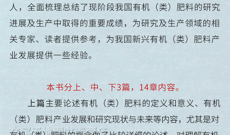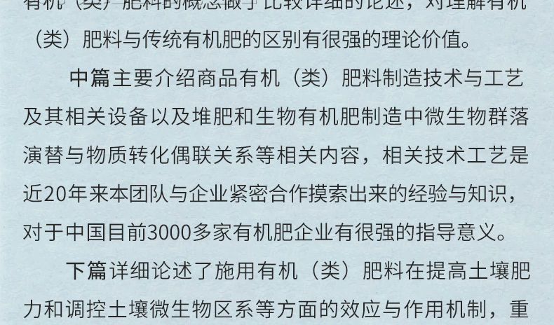 本書的上篇主要論述有機(類)肥料的定義和意義、有機(類)肥料產業發展和研究現狀與未來等內容,尤其是對有機(類)肥料的概念做了比較詳細的論述,希望讀者閱讀後能夠理解有機(類)肥料與傳統有機肥的區別。本書的中篇主要介紹商品有機(類)肥料製造技術與工藝及其相關設備以及堆肥和生物有機肥製造中微生物群落演替與物質轉化偶聯關係等相關內容,這部分內容對於目前我國3000多家有機肥企業有一定的指導意義,因為這些技術工藝都是近20年來作者團隊與企業緊密合作摸索出來的經驗與知識。本書的下篇比較詳細地論述了施用有機(類)肥料在提高土壤肥力和調控土壤微生物區係等方面的效應與作用機制,重點介紹了核心功能微生物菌株的作用機制、利用含核心菌株的有機(類)肥料調控(根際)土壤微生物區系和土壤微生物分子生態。本書內容主要是總結了南京農業大學“有機肥與土壤微生物”研究團隊(神農中華農業科技獎很好創新團隊)30多年來......