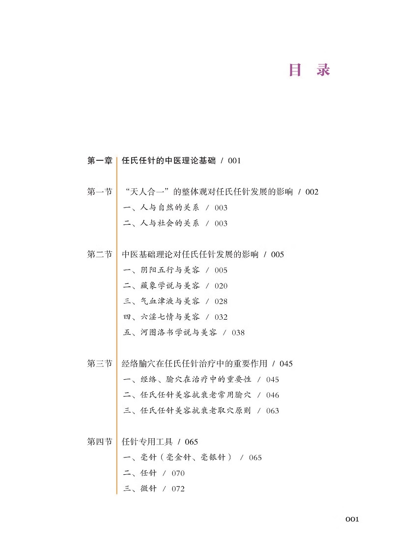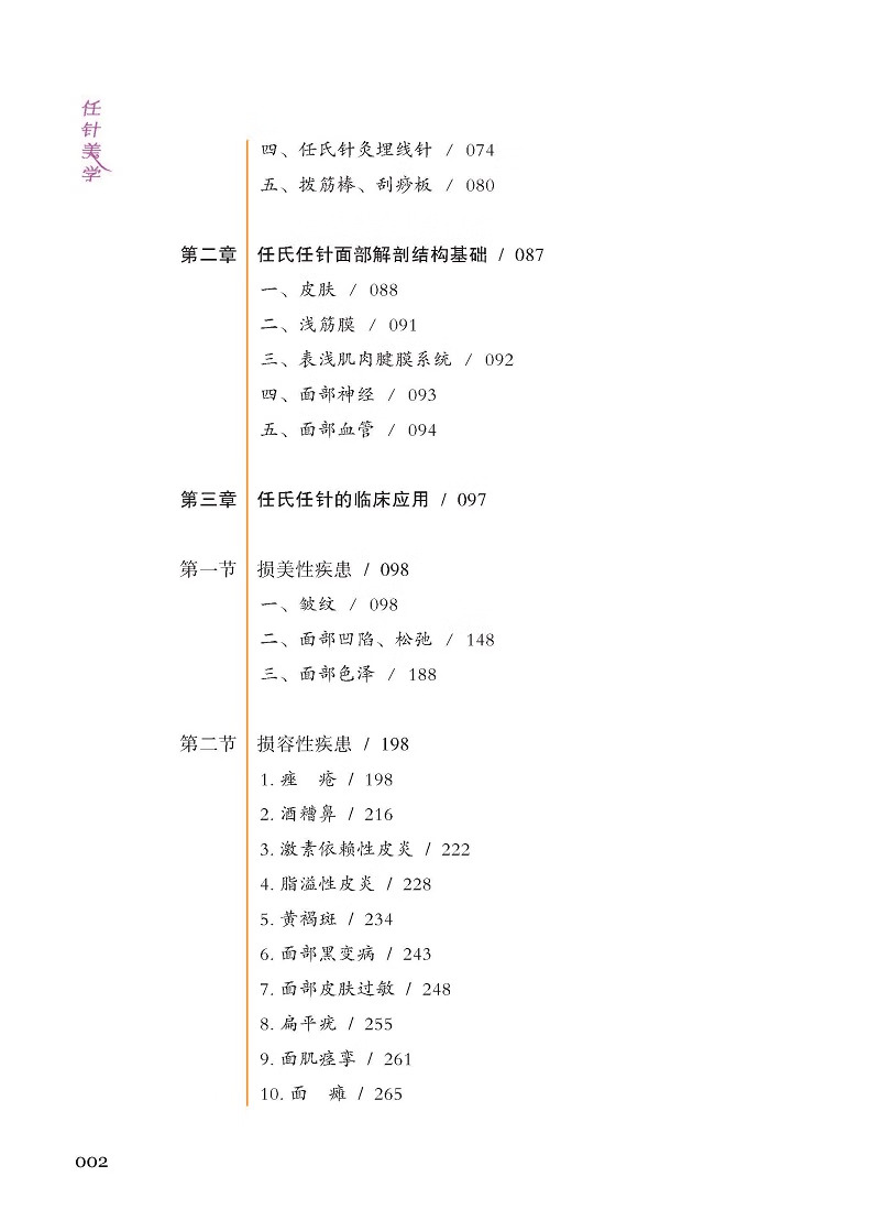 《任針美學》結了任曉艷博士30 餘年臨床經驗的一本美容、抗衰老臨床實踐指南用書。該書系統介紹了任氏抗衰老中的各種工具及操作手法,收集大量臨床中的損美性病症(如皺紋、面部鬆弛等)、損容性病症(如痤瘡、黃褐斑等)、損型性病症(如肥胖、富等)及女性產後修復(如盆底肌鬆弛、產後肥胖等)、乳腺(如乳腺增生、副乳等)等常見問題。對其發病原因、方行了詳細講解並配以大量圖片,讀者熟練掌握任氏針法技巧,以達到效果。本書具有較高的中醫醫學美容臨床實用價值,既可作為醫學院校教材或參考用書,又是廣大求美者美容抗衰老的實用讀本。