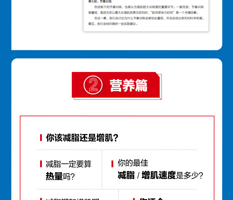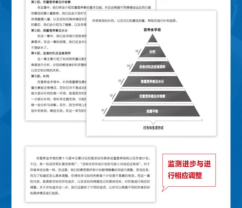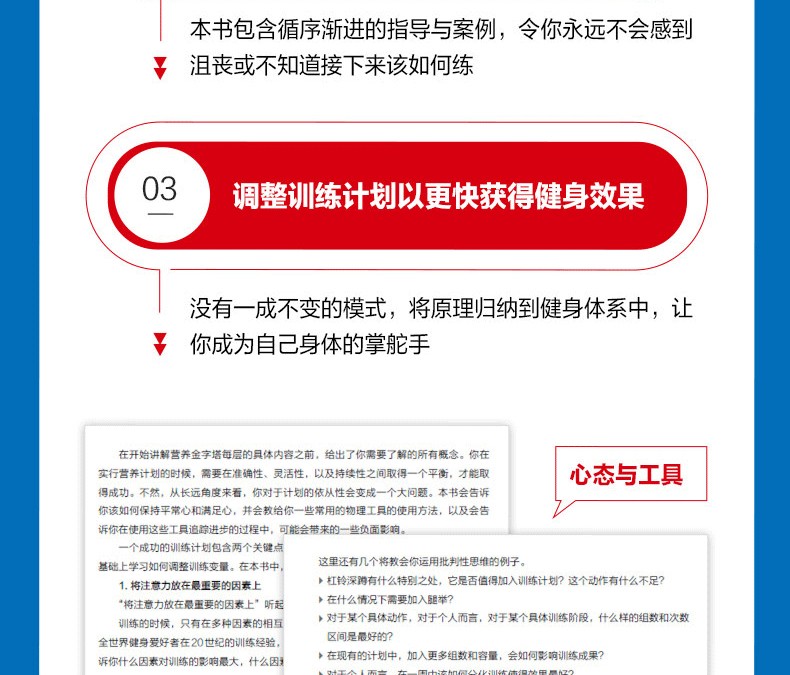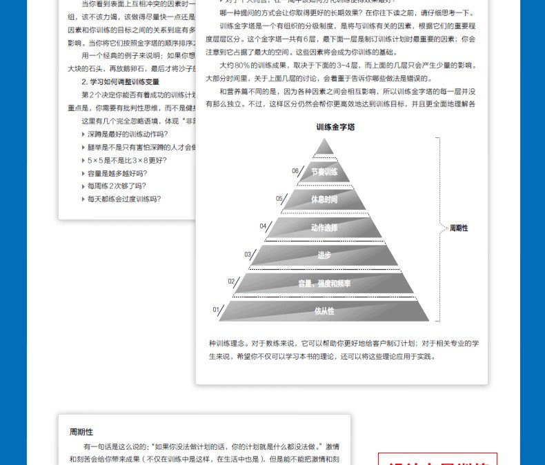 肌肉與力量全書 通過構建“金字塔”的概念為讀者詳細地闡述了肌肉與力量訓練中訓練和營養的概念及方法,旨在利用科學的理論幫助讀者建立起基礎的訓練概念框架,並逐步形成系統的訓練體系,從而實現自己的訓練目標。全書分為訓練篇、營養篇和備賽與生活篇,從健身的基礎理論和對訓練中各種因素分析的“訓練金字塔”,到如何安排飲食和營養計劃的“營養金字塔”,再到形體和力量比賽的備賽策略,涵蓋了健身的方方面面。此外,本書的另一大特點是作者用通俗易懂的語言來論述深奧的理論知識,為非專業人士學習相關理論提供了便利。因此,不論您是健身愛好者、健身教練,還是專業的備賽指導教練,通過閱讀本書,都將會在相關的知識儲備和訓練實踐方面獲得 的進步。