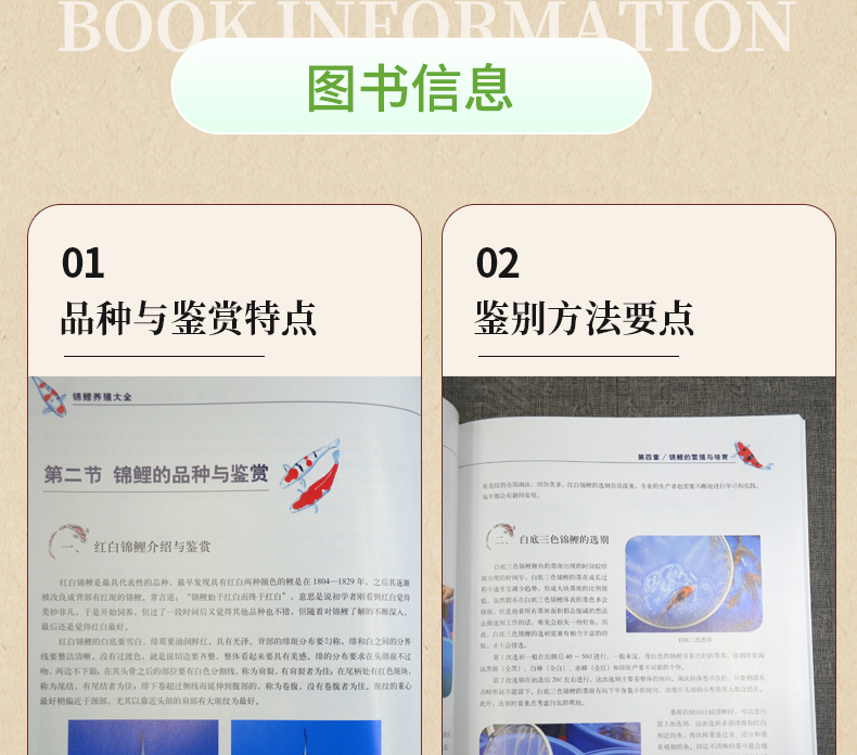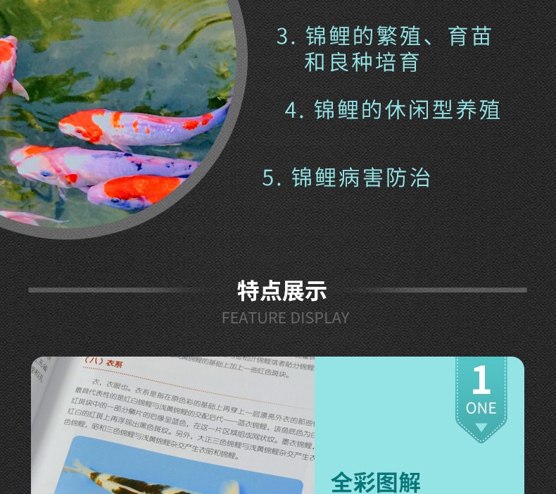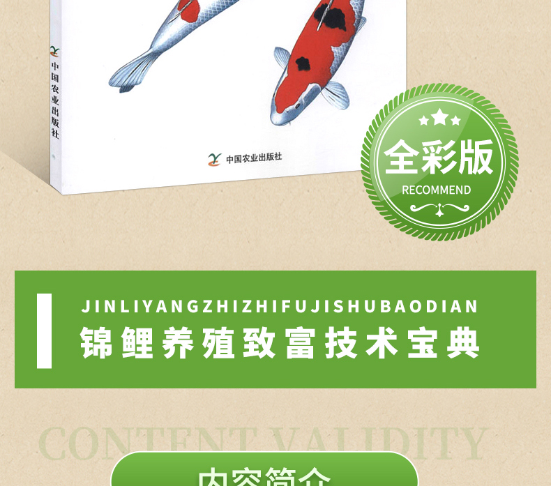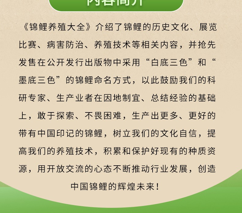 《錦鯉養殖大全》介紹了錦鯉的歷史文化、展覽比賽、病害防治、養殖技術等相關內容,並在公開發行出版物中採用'白底三色'和'墨底三色'的錦鯉命名方式,以此鼓勵科研專家、生產業者在因地制宜、總結經驗的基礎上,敢於探索、不畏困難,生產出更多、更好的帶有中國印記的錦鯉,樹立文化自信,提高養殖技術,積累和保護好現有的種質資源,用開放交流的心態不斷推動行業發展,創造中國錦鯉的輝煌未來!