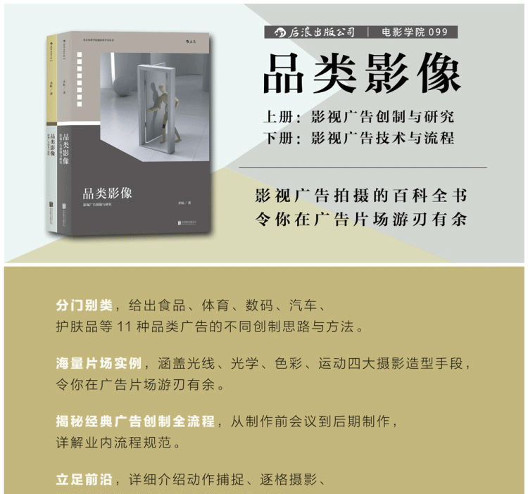 《品類影像》分為上、下二冊。上冊《影視廣告創制與研究》偏重於各品類影像的具體創作情況,下冊《影視廣告技術與流程》則對品類影像製作的常用技術及流程作細緻講解。