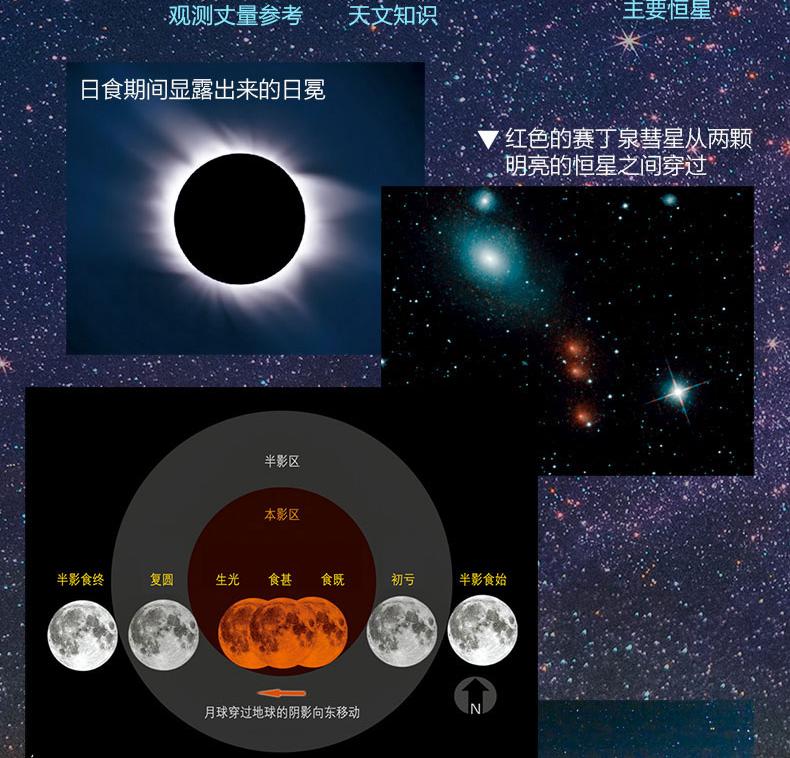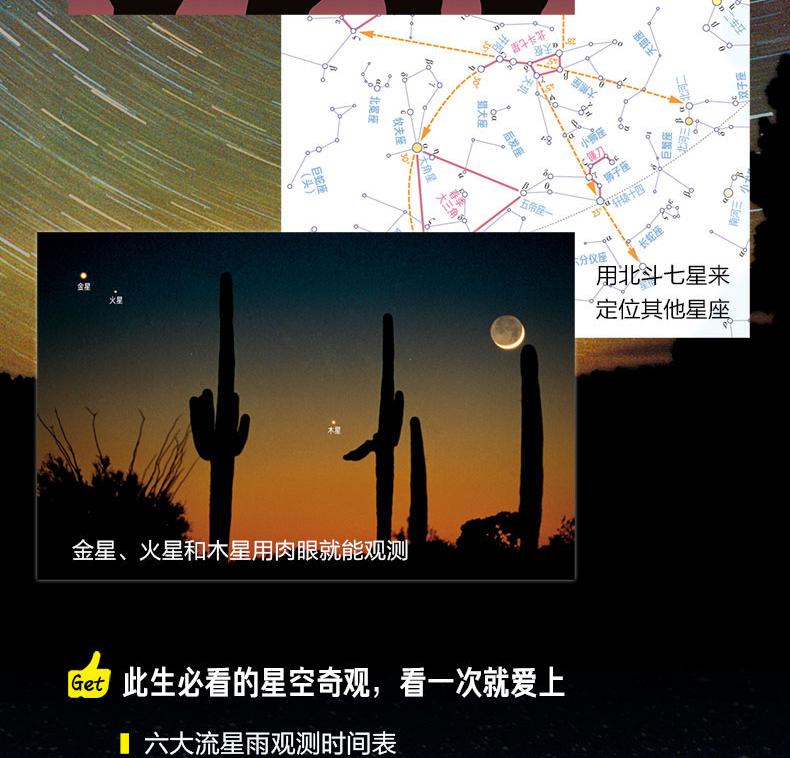 本書共10章,從觀星的基礎技巧講起,講述星空定位的基本技巧和操作;而後按照觀測對象,逐一介紹了地球大氣、太陽、月亮、星星、彗星和流星、深空中的黑洞和超新星,帶你了解它們呈現的天文奇觀、對應的觀測時間和觀測方式以及相關的天文知識和故事傳說;最後按照觀測季節,帶你遨遊夜空,看到每個季節的綏爛星空,探訪北半球可以觀測到的全部58個星座,了解每個星座的主要恆星、相關星系和其他深空天體。在每章的最後,對應的專題策劃會為你帶來一些實用的觀星技巧和建議,例如如何挑選雙筒望遠鏡和對應天文奇觀的詳細拍攝參數。