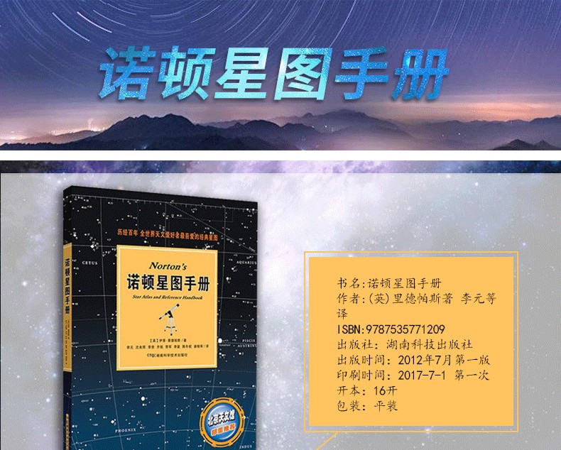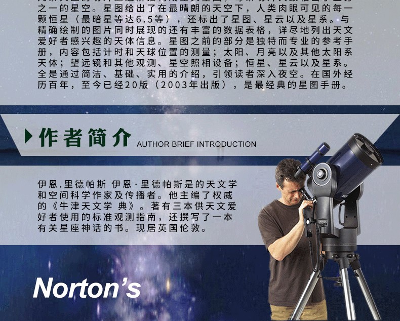 廣大天文愛好者把伊恩·里德帕斯編寫的《諾頓星圖手冊》簡單而親切地稱為“諾頓的星圖”:它是全世界*著名的星圖。這本集星圖和參考手冊於一身的里程碑式的著作,堪稱星圖領域的「無敵艦」。