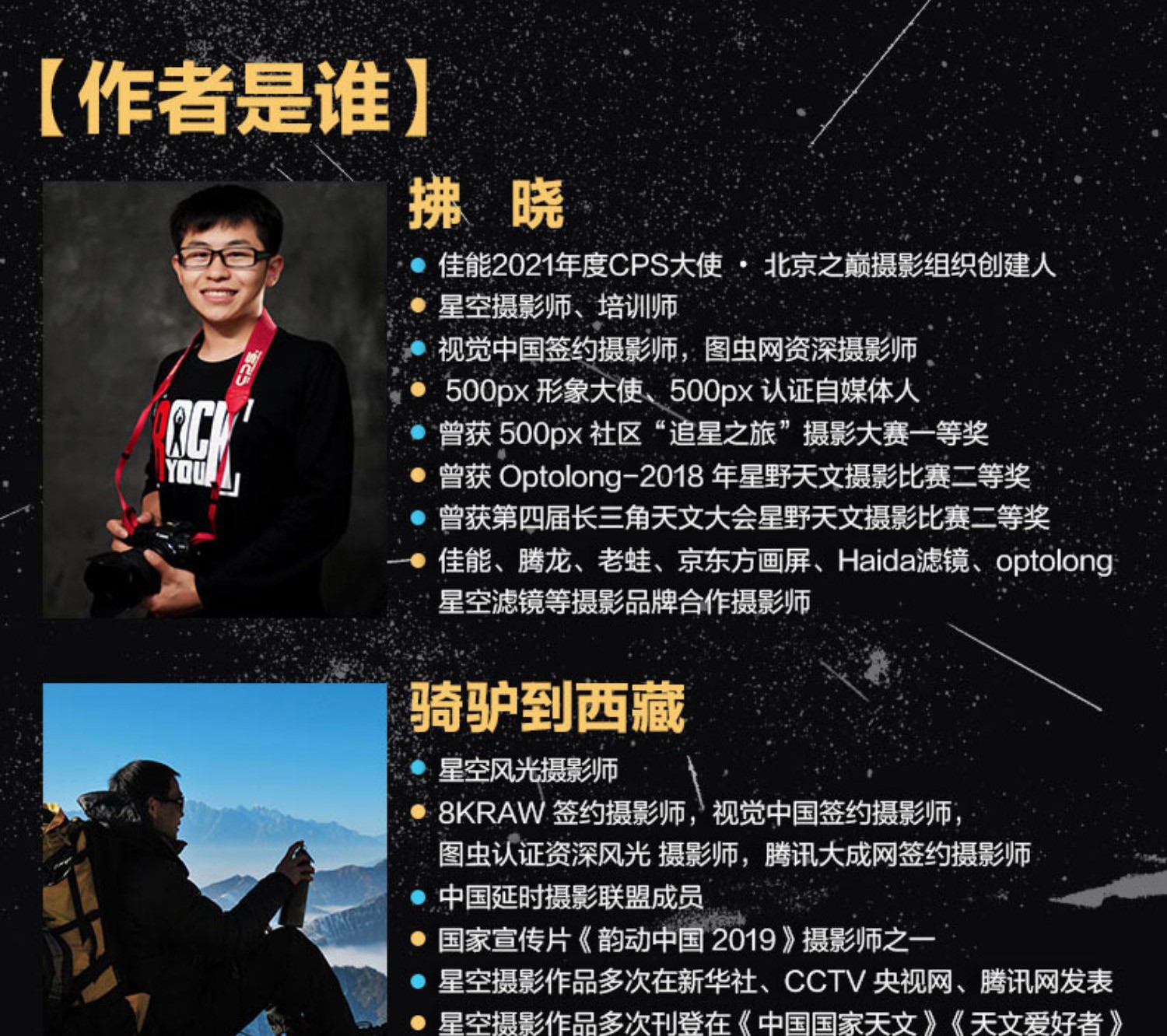 本書適合初學星空攝影的愛好者,以及想要進一步學習如何拍攝月亮、銀河、星雲、星軌、流星雨以及星空延時視頻的星空攝影進階者。