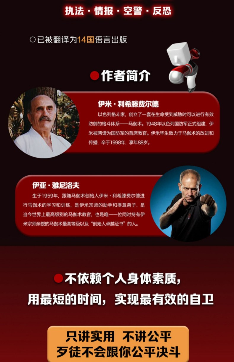 本書是一本以色列格鬥術Krav Maga實用自衛指南,*初以希伯來文寫成,曾經是嚴格限於以色列安全人員和精英成員的職業技法。開放傳播後迅速贏得世界各國專家的認可和普及,已被翻譯為14國語言出版。