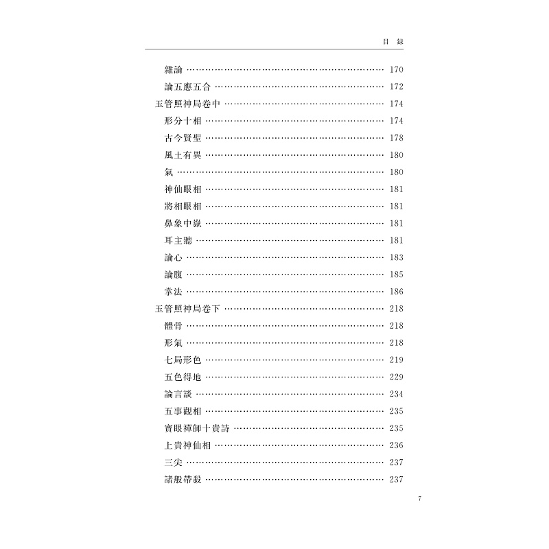 本書收錄《古觀人法》《神相全編》《相法十六篇》《鑑辨小言》《神相鐵關刀》《白鶴仙數相法》等作品。其中《神相全編》卷帙宏富,廣採諸家,內容詳備,堪當中國古典相人術集大成之作品。此書明清時流傳較廣,《麻衣相法》《統會諸家相法》等皆據其剪裁而成。 《古觀人法》與《鑑辨小言》短小精悍、眉目清朗,為文人相法之代表作品。其中《鑑辨小言》又名《冰鑑》,在近現代頗具影響力。 《相法十六篇》《神相鐵關刀》《白鶴仙數相法》三書文辭簡易,實操性強,為術士相法之代表作品。本書蒐集諸多版本,對所選作品進行了精心點校,供相法研究者和愛好者參考。