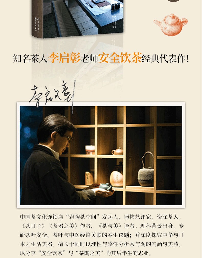 李啟彰,中國茶文化傳播者,茶具連鎖店“岩陶”總經理。上海復旦大學EMBA,美國聖母大學MBA,淡江大學物理系畢業。理科背景出身,因緣際會踏入茶道世界,自2009年在中國大陸推廣茶文化以來,已舉辦超過百餘場的茶會與講座。近來更以“無毒飲茶”為職志,從科學角度解密品茶,以實際行動宣傳及追求有機生活的方式。
