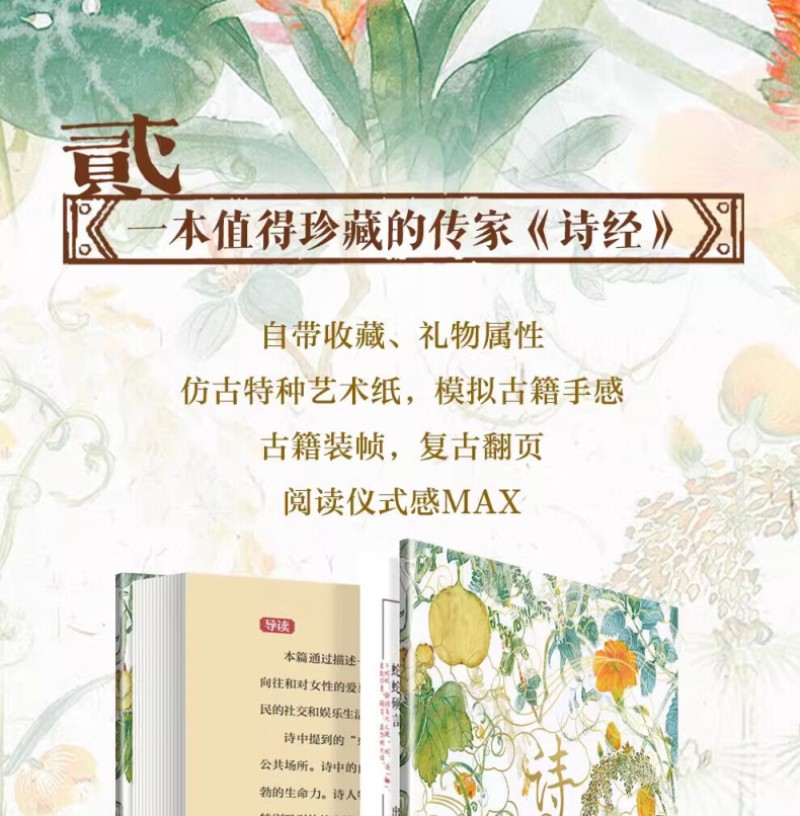 本書包括上、下兩冊。本次出版的《詩經》既是文學巨著,也是藝術畫冊。本書特別收錄了馬和之、乾隆版等多個經典版本的詩經插圖,他們以獨特的藝術視角,生動再現了詩歌中的經典場景。並且收錄了原著的全部內容,更邀請了權威專家對每一篇詩歌進行詳盡的導讀、註釋和解讀,深入剖析詩歌背後的歷史文化內涵。我們這部全新版本的《詩經》,將帶領讀者領略中華文化的博大精深,感受古代詩歌、繪畫的無窮魅力。無論是文學、藝術愛好者、研究者,或是對中國傳統文化有興趣的讀者,都能從中獲得深刻的啟示和美的享受。