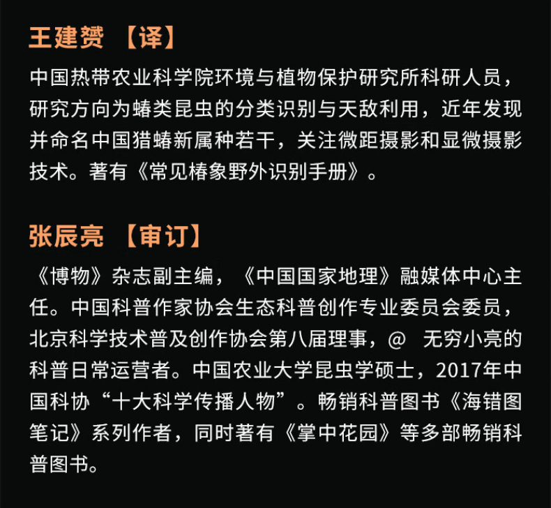 科學研究人員實力翻譯,「無窮小亮」張辰亮審訂。中國熱帶農業科學院環境與植物保護研究所科研人員王建贇傾心翻譯,特約博物君「無窮小亮」審訂全書,為中文版的科學性把關。