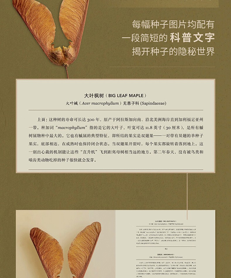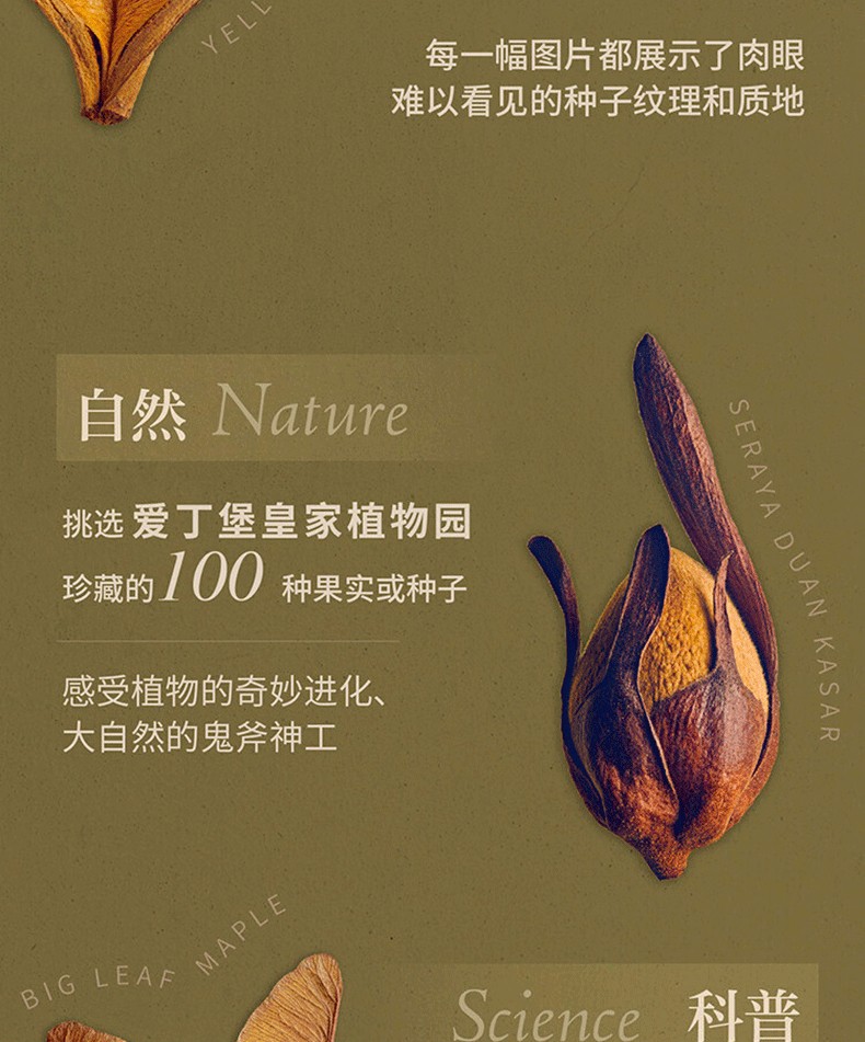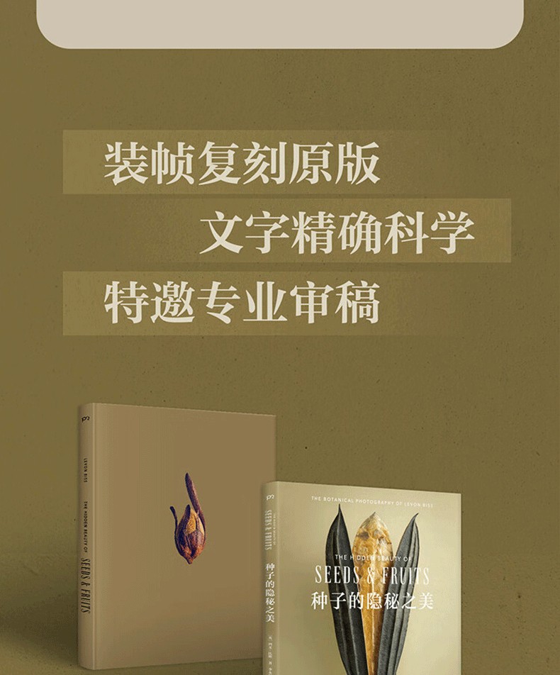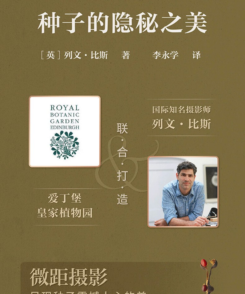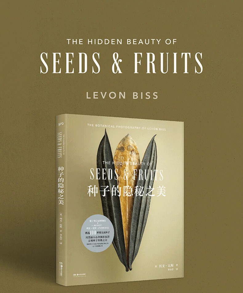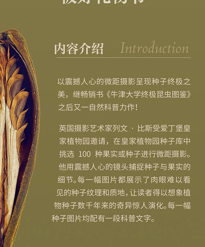 英國攝影藝術家列文·比斯受愛丁堡皇家植物園邀請,在皇家植物園種子庫中挑選100種果實或種子進行微距攝影。他用震撼人心的鏡頭捕捉種子與果實的細節。每一幅圖片都展現了肉眼難以看見的種子紋理和質地,讓讀者得以想像植物種子數千年來的奇異驚人演化。每一張種子圖片均配有一段科普文字。