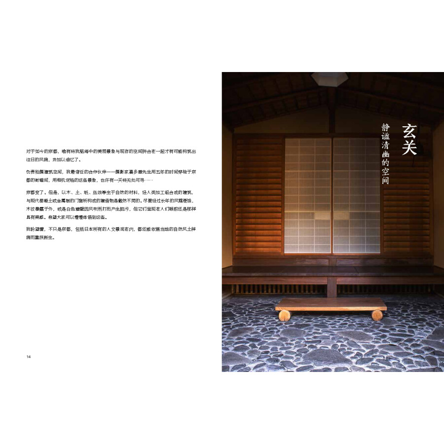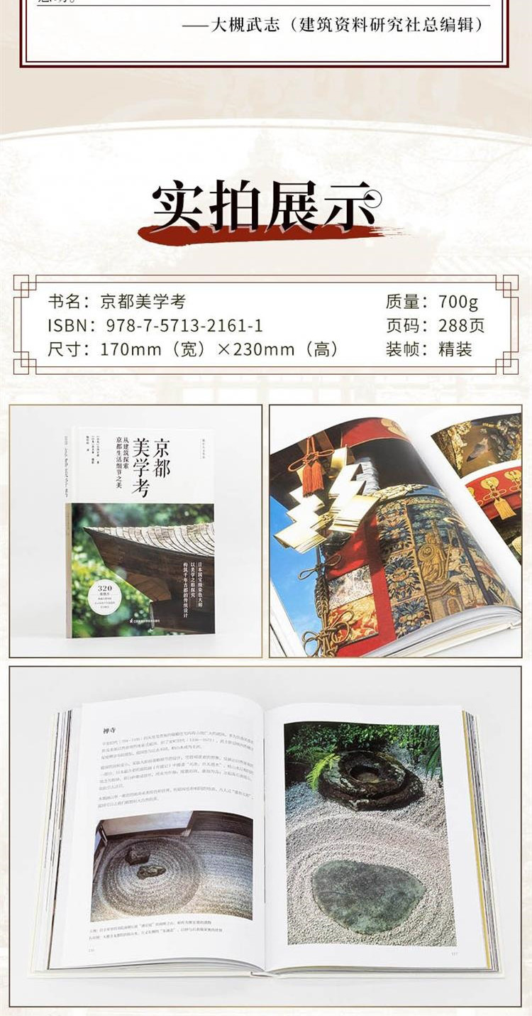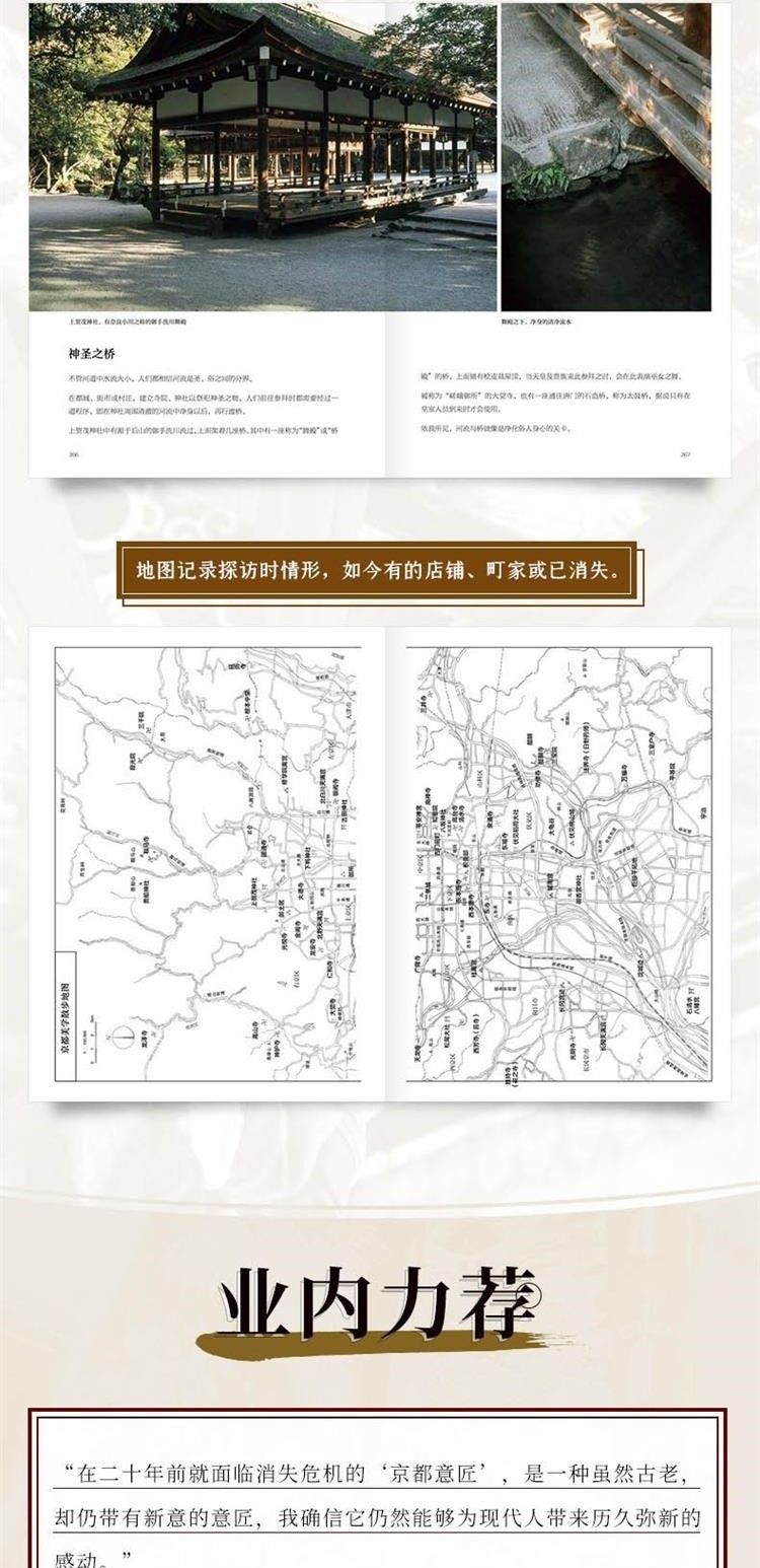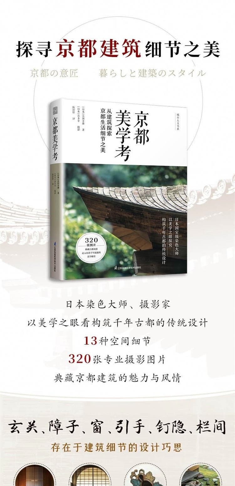 日本染織史家吉岡幸雄,在本書中以深厚的美學素養細數存在於京都的建築,探究建築與美學元素的根源,記錄面臨消失危機的美麗日本傳統風景。全書分為兩個篇章,章講述京都的住宅與生活設計,如玄關、窗、坪庭等;第二章講述京都的街景與建築設計,如門、塀、垣、屋頂、小徑等。全書收錄超過320張專業攝影照片,並附有京都美學散步地圖,讀者可從攝影師喜多章所拍攝的珍貴照片中,窺見留存在京都建築中的懷舊風景與裝點京都街道的日本傳統設計