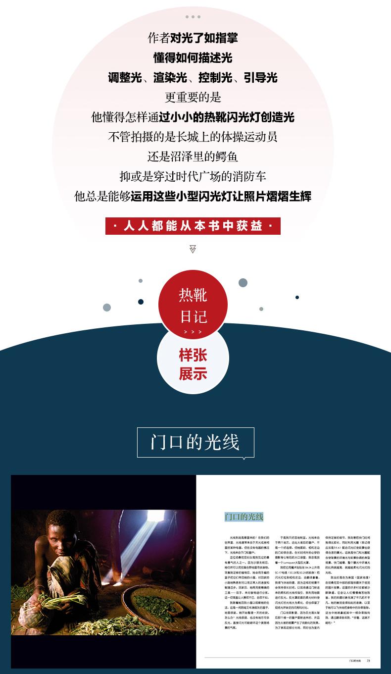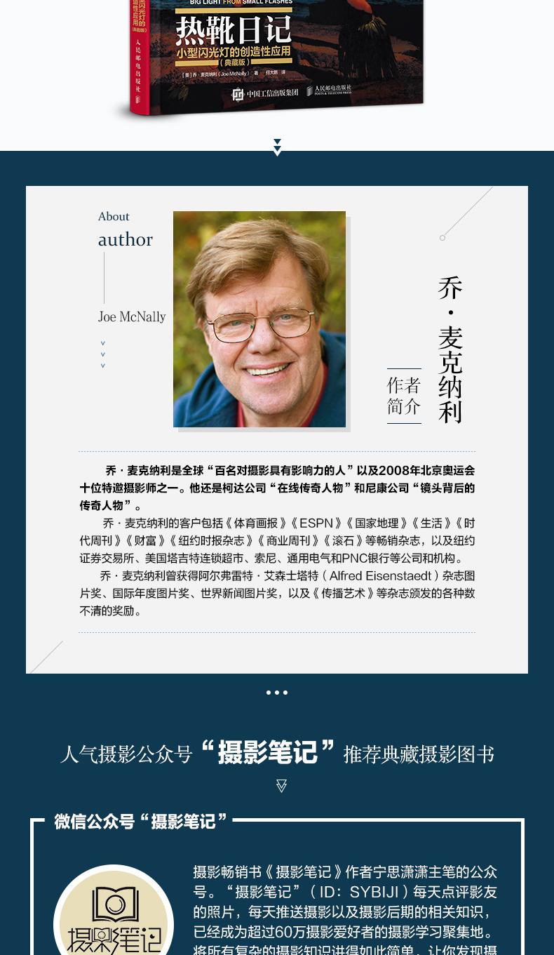 本書是美國有名攝影師喬·麥克納利繼經典暢銷書《瞬間的背後》之後推出的又一部力作。與前作全方位地綜合介紹各種攝影技巧和概念不同,作者在本書中著重帶領讀者探索熱靴閃光燈在攝影中的應用。以開篇系統介紹各種器材、附件為基礎,他將從最簡單的單燈應用出發,逐步擴展到雙燈、多燈應用,以他親身拍攝的雜誌或商業圖片為實例,深入淺出地向讀者展現閃光燈攝影的多彩世界。無論您具備多少攝影經驗,您都能從本書中學到以前難以想像的攝影技巧,並在實戰中領略到一名職業攝影師既有趣又迷人的一面。
