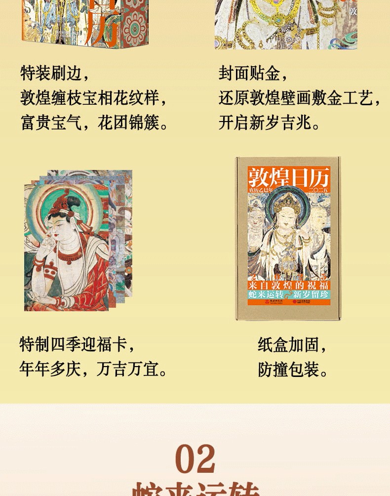 5. 【新歲美物】歲朝,一歲之始,開啟新歲吉兆。封面貼金,還原敦煌壁畫敷金工藝。手工裝裱,布面書脊,延續匠人傳統。內頁選用特殊米色藝術紙,印色清晰,閱讀舒適。特製四季迎福卡,四時流轉,除舊往,生新意。宜珍藏案頭,宜饋贈年禮。
