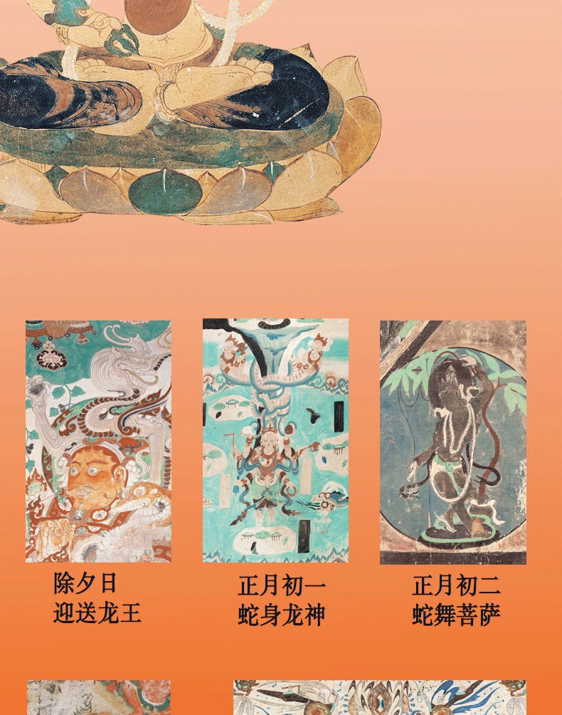 1. 【蛇來運轉,瑞靈獻福】2025年,農曆乙巳年,生肖蛇。傳統民俗文化中,相傳龍由蛇變化而來,蛇被稱為“小龍”,有祥瑞、敬畏、辟邪的象徵。正月特別選取多幅蛇元素壁畫,蛇身龍神、蛇身伏羲守寶、蛇舞菩薩、化蛇鬥法…傳遞消災除厄、納福迎祥之願。年年多慶 萬吉萬宜,接收來自敦煌的祝福。