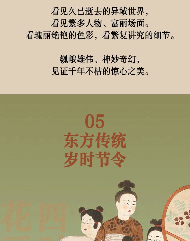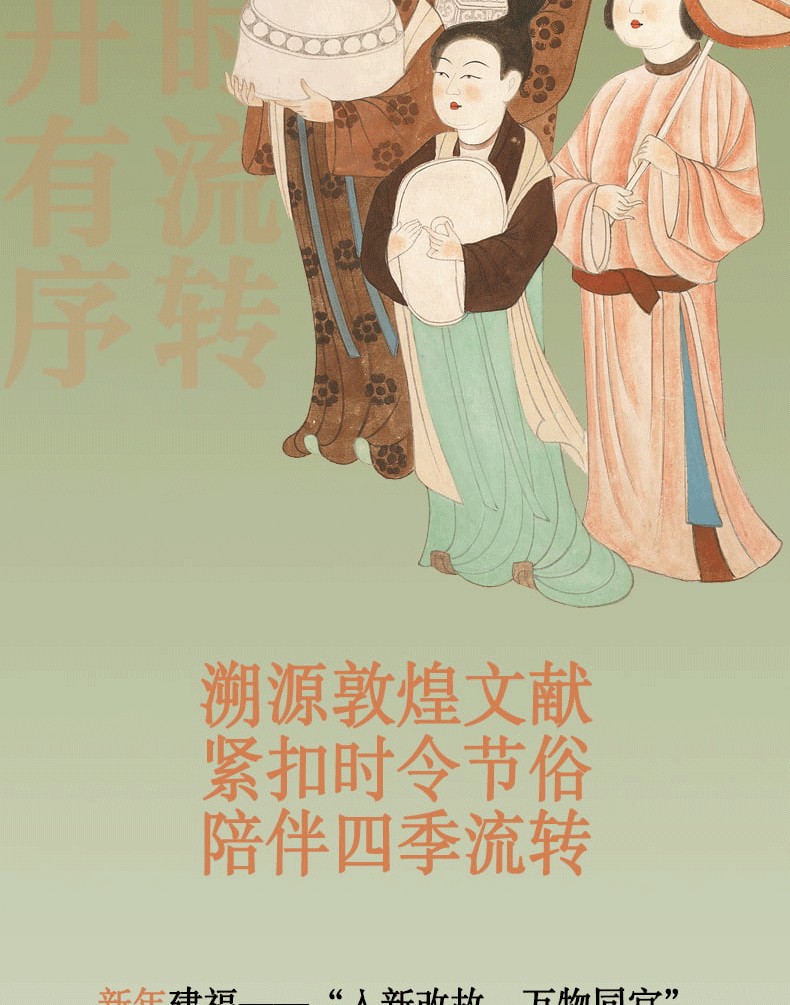 4. 【傳統文化之美】一日一圖,配有專家解讀。每月溯源敦煌文獻,緊扣時令節俗,四時流轉,花開有序,體味傳統風雅生活。新年建福,“入新改故,萬物同宜”,入春迎風踏青,“時候花新,春陽滿路”,炎夏消暑養心,“各賜團扇,願揚仁風”,清秋賞月觀星,“順風調而應節”,隆冬溫酒小酌,“長至初啟,佳節應期”,千年前古人的鬆弛與浪漫,婁道來。