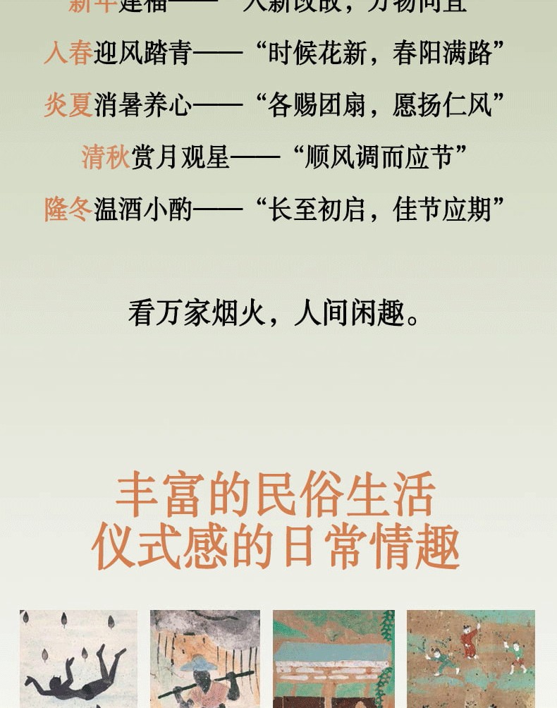 山中郊遊、消暑游泳、酒肆小聚、孩童摘花、屋中讀書、林間打獵……從眾多角度展現豐富的古代民俗生活,以及古人納福驅災的願望。