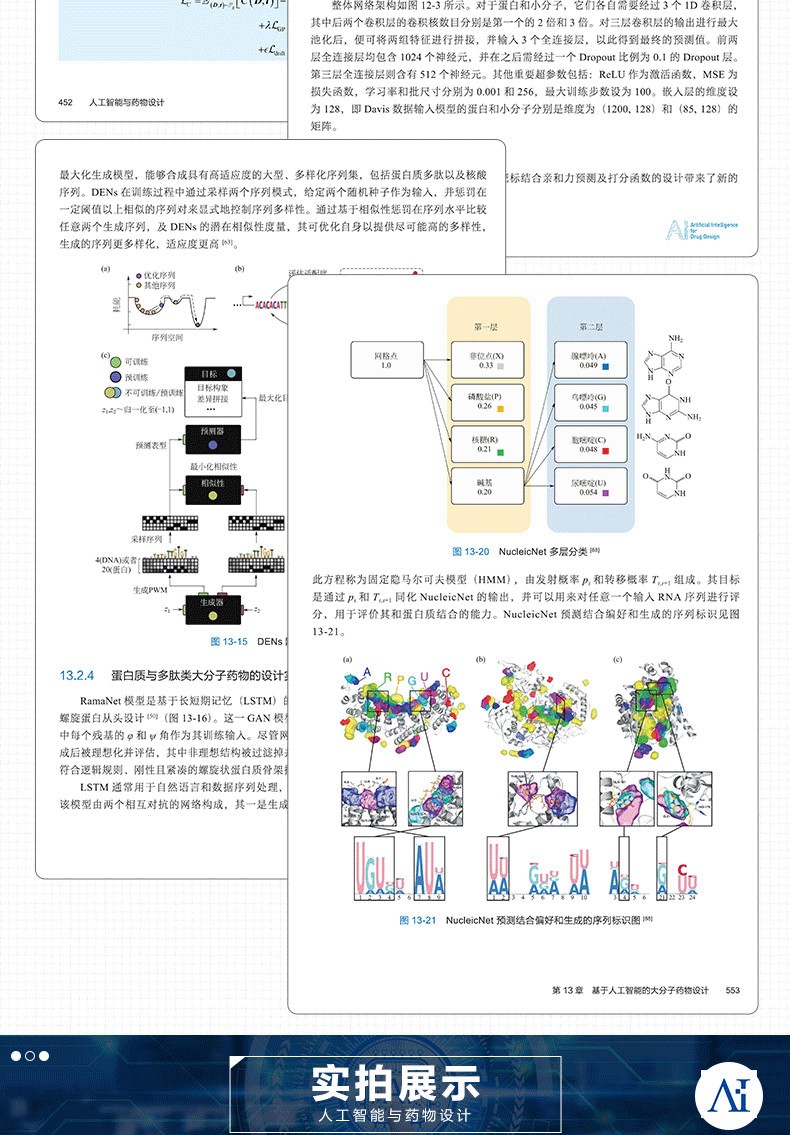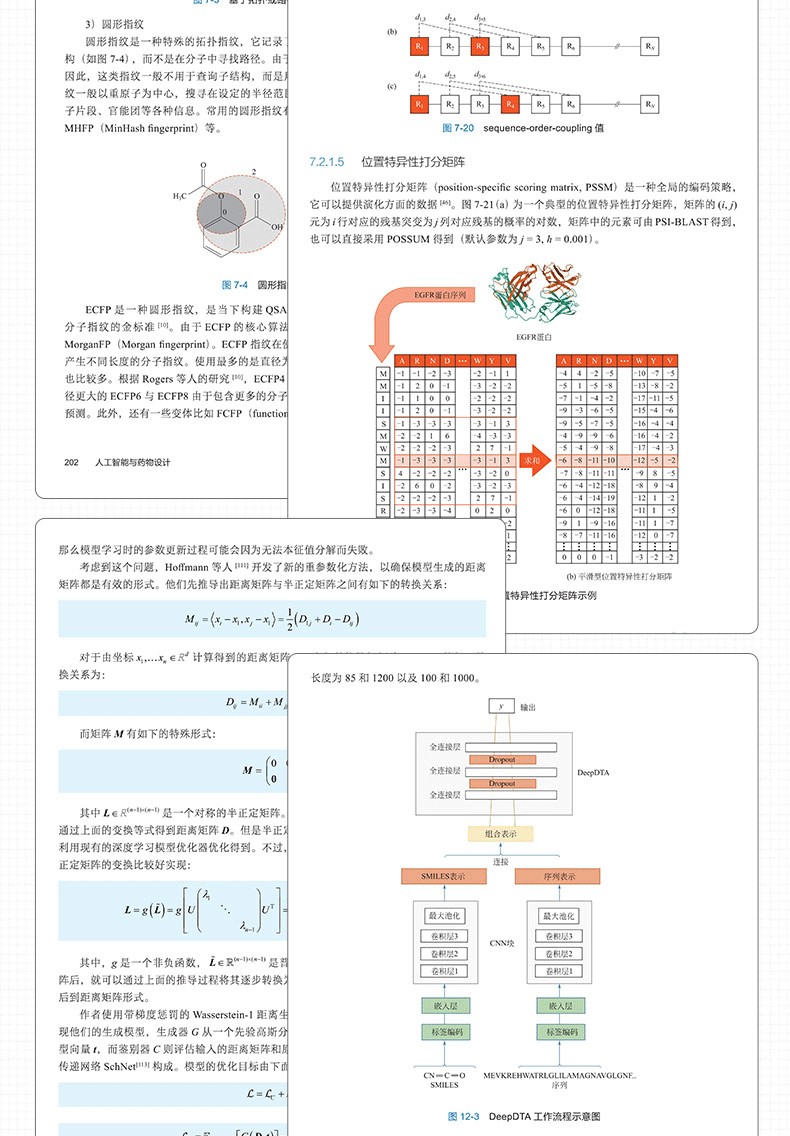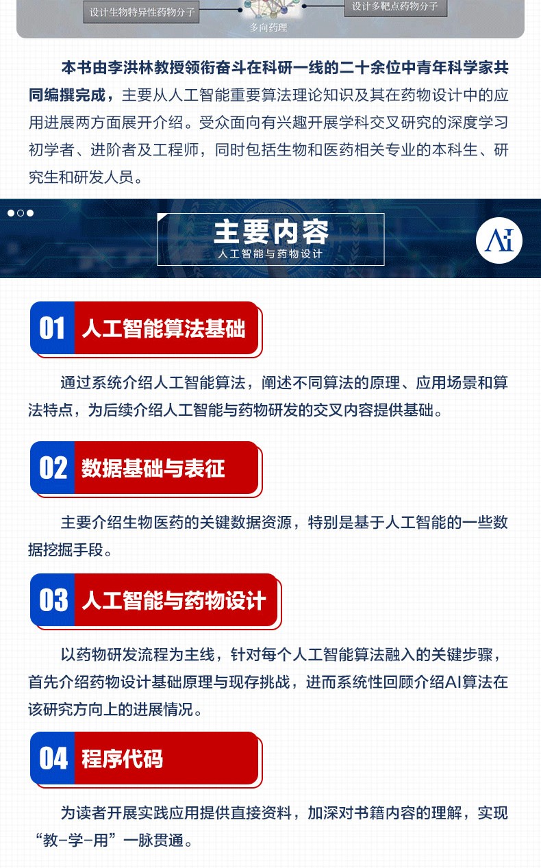 ② 目標面向藥物科學、生命科學領域與電腦科學領域的交叉研究。分別以介紹人工智慧演算法與藥物設計原則為基礎,闡述基礎原則;介紹交叉應用與研究進展,讓讀者概覽前沿內容;之後提供程序程式碼實例,讓讀者學以致用,進行實戰練習。 「教-學-用」一脈貫通。