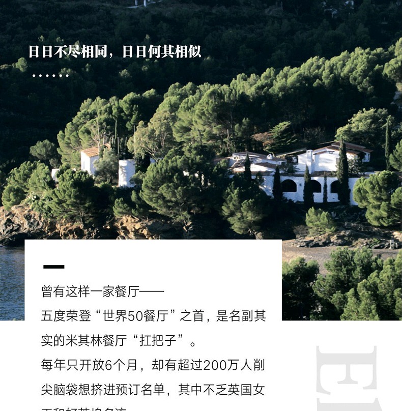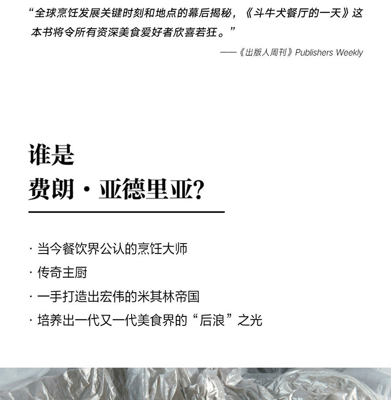 位於西班牙加泰隆尼亞玫瑰城的鬥牛犬餐廳以分子料理聞名於世,1961年開業,曾多次獲得米其林三星,並連續5年成為全球餐廳評選的榜首。這家餐廳每年接到超過200萬份預定請求,但由於其主要工作內容是菜餚創新,全年的開門迎客的時間只有160天,因此每年僅能招待約8000名食客,可謂一席難求,被追崇為“魔幻餐廳”。該餐廳於2011年歇業,隨後轉型為烹飪研究中心,延續其半世紀的輝煌。 《鬥牛犬餐廳的一天》向每位美食愛好者敞開了大門,以細膩的闡釋和壯觀的場景向讀者揭示這件傳奇餐廳內部運作,以及美食創意的奧秘。本書包含超過1000張精美照片,其中包括罕見的食譜和創意筆記,讓讀者一窺廚神團隊的創意方法和美食哲學,也看到這位烹飪大師的情感與內心。