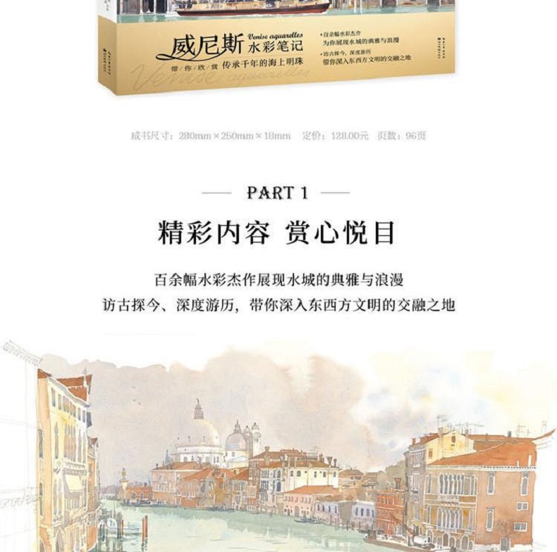 在《威尼斯水彩筆記》中,法國著名水彩畫家法布里斯·穆瓦羅用120餘幅精彩的作品描繪了威尼斯典雅浪漫的城市風貌,展現了威尼斯兼容併包的美。