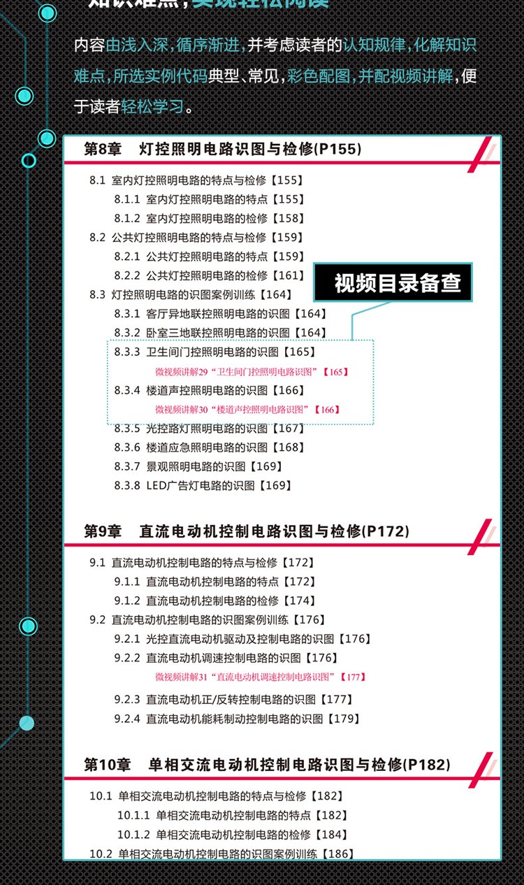 用部件安裝與接線,電子元器件與電子電路識圖,供配電電路識圖與檢修,燈控照明電路識圖與檢修,直流電動機控制電路識圖