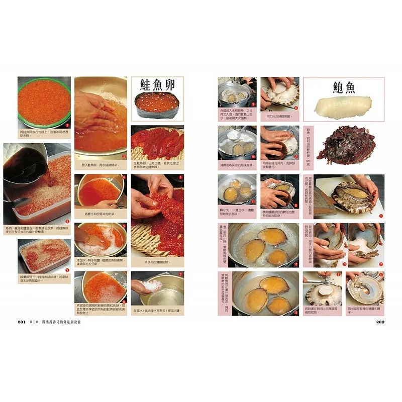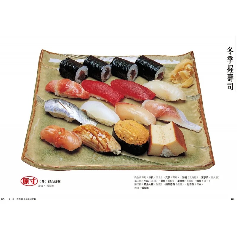 ■親手體驗日本代表和食,專業人士工具書。本書鉅細靡遺地收錄了當代第一的壽司職人小野二郎一整年間供應的所有菜單,包括握壽司、下酒菜以及小缽配菜等等,是終極版的「江戶前壽司技術指南」。瞄一下「數寄屋橋次郎」特有的原木食材盒,一看就知道裡面盡是日本近海的當令漁獲。在寒冬時節,白肉魚之王是比目魚;夏天則小鱸魚(日本關東地區的發音是FUKO,指鱸魚長約30~60cm的幼魚)和真鰈。章魚腳在冬天*是夠味,關東地區的鮑魚產季是夏天。蝦蛄雖然一年到頭在市場都買得到,但在春天帶有蝦卵的蝦蛄*是美味──。這是一本十分有用的工具書,是可以幫助您「認識當令食材的食曆」。