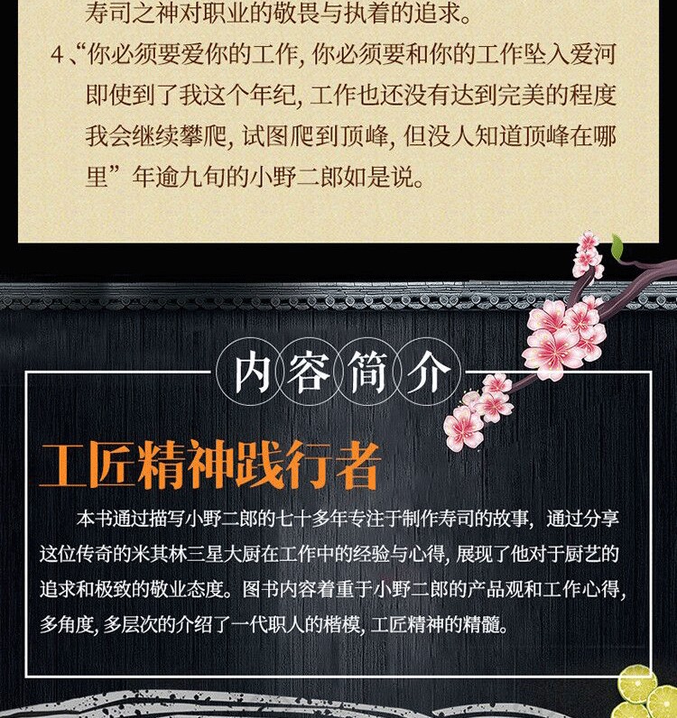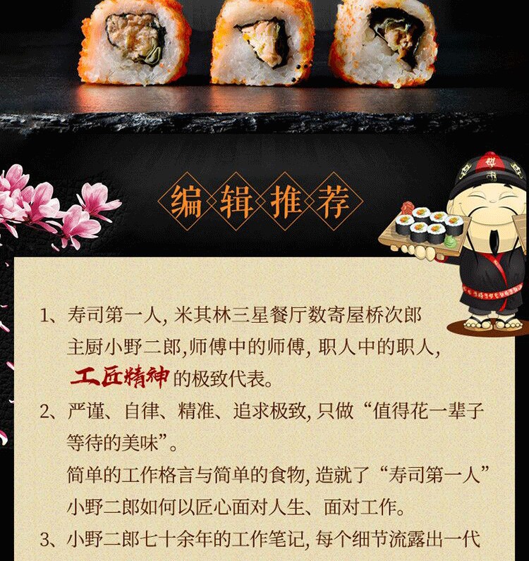 1、壽司第一人,米其林三星餐廳數寄屋橋次郎主廚小野二郎,師傅中的師傅,職人中的職人,工匠精神的很好代表。 2、嚴謹、自律、精準、追求很好,只做“值得花一輩子等待的美味”。最簡單的工作格言與最簡單的食物,造就了“壽司第一人”,小野二郎如何以匠心面對人生、面對工作。 3、小野二郎七十餘年的工作筆記,每個細節流露出一代壽司之神對職業的敬畏與執著的追求。 4、“你必須要愛你的工作,你必須要和你的工作墜入愛河……即使到了我這個年紀,工作也還沒有達到完美的程度……我會繼續攀爬,試圖爬到很好,但沒人知道很好在哪裡”......